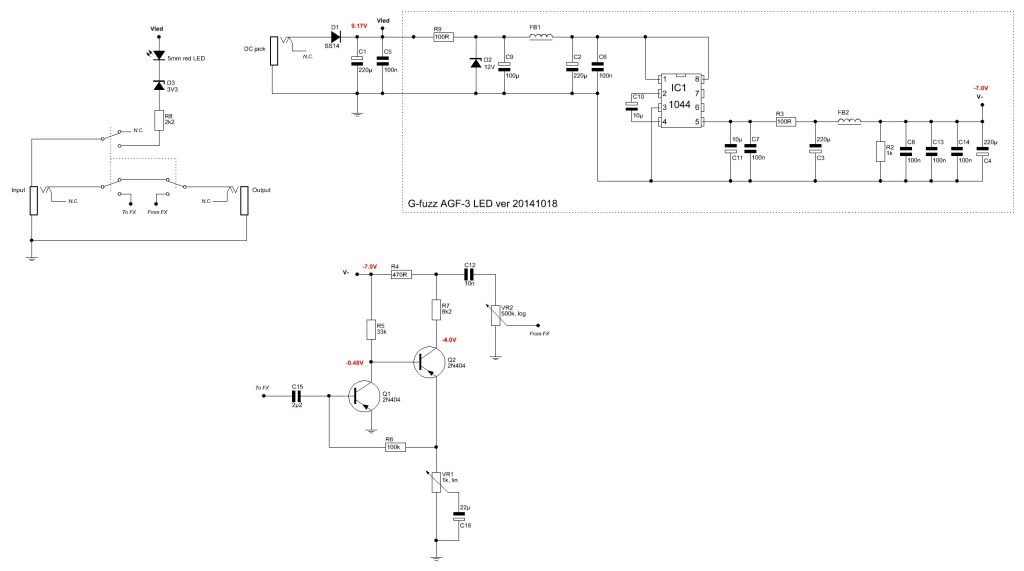 On the inside there is a full 1:1 copy of a vintage Fuzz Face with 2x 2N404 germanium transistors but then made with SMD components. Most caps are SMD; in the Mooer though one cap is a through hole cap. The add-on board (easily removeable in the Tom’s line) is a circuit to change the voltage from positive to negative so you can power the pedal with a center negative 9V adapter. This circuit is build around a 1044 charge pump.