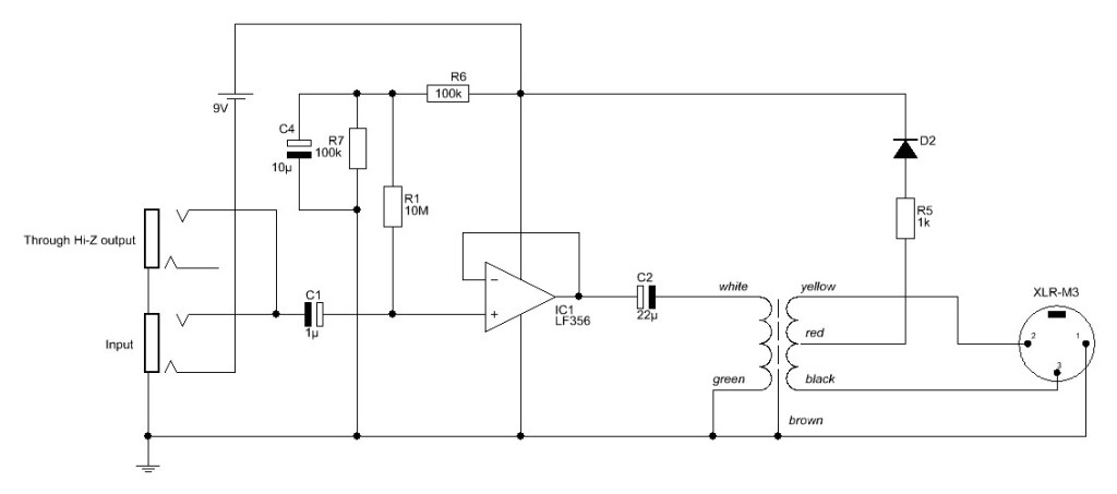 This hybrid DI box from Sescom uses a buffer (from a LF356 IC) into a transformer. The quality and brand of the transformer is unknown, yet the size of this unit is impresive. It goves you the assumption it is of good quality.