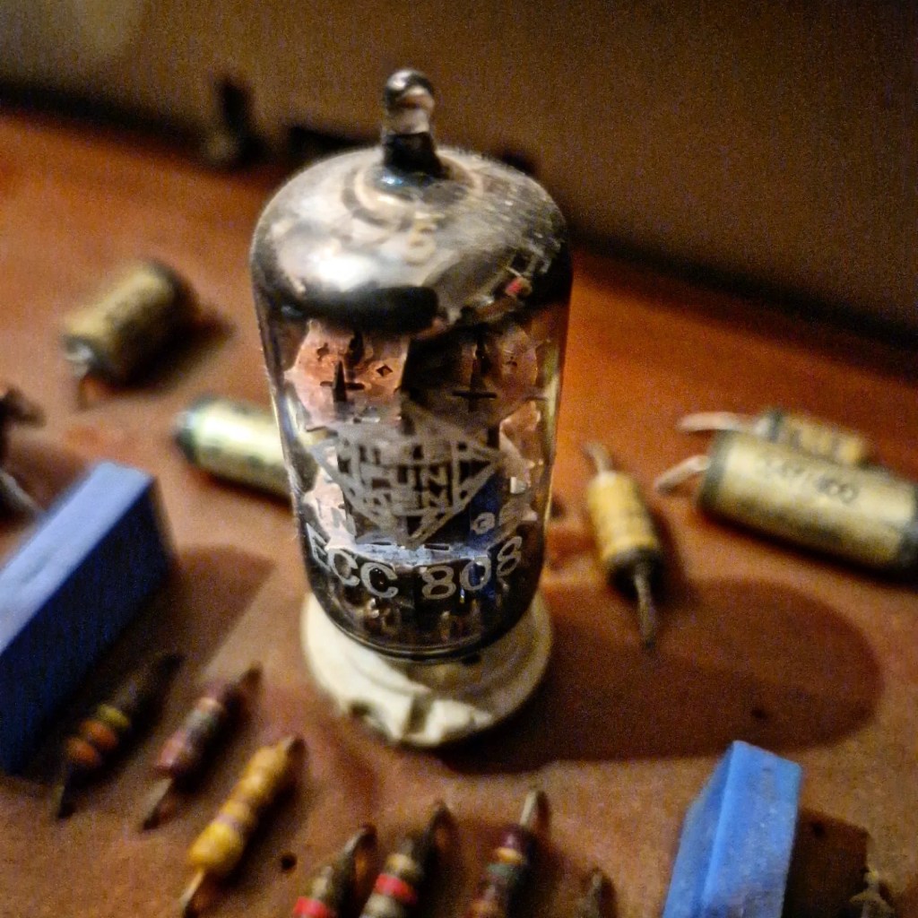 The ECC808 (1963) tube is in performance equal to the ECC83 / 12AX7 tube, but the noise and microphony specs are much better. This is done by shortening parts of the tube, adding a much thicker mica plate and adding a shield between the two parts of the tube. This way this tube was much quieter then most ECC83 tubes. They are pretty common in German amps and are pretty expensive if you’d like to replace them.