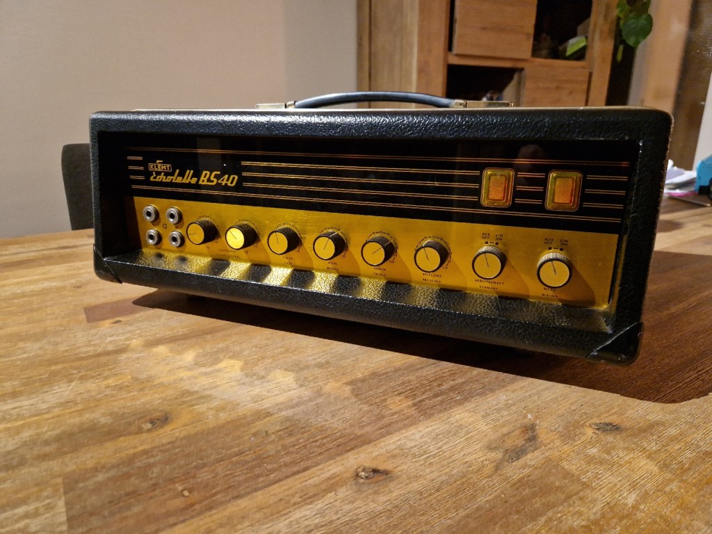 The BS40 would be produced around 1965 and is, inside, a close working clone of the Fender Bassman ’59 (or Marshall range) with a solid state rectifier. Only small changes were made to the design. Multiple versiosn were made of this amp in multiple different chassis. This one pictured here is one of the later models with turning switches.