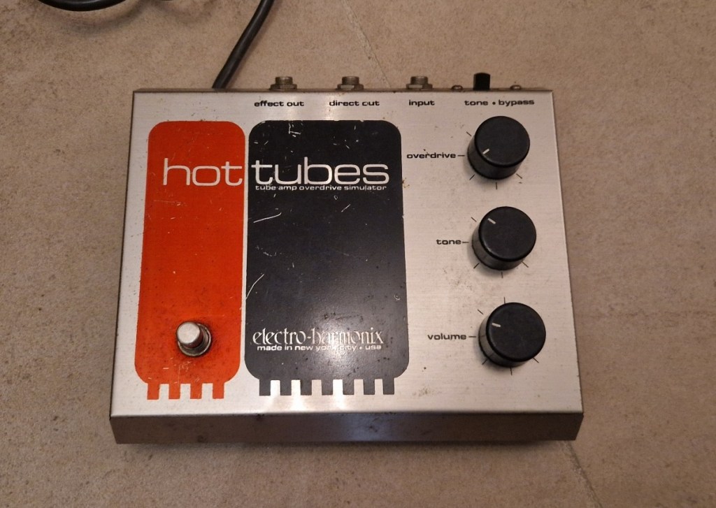 The EHX Hot Tubes (not to be mistaken for the tube version (the EHX Hot Tubes tube pedal) and the EHX Hot Tubes Nano (the small version of it) is a pedal made from 1978 up until 1984 and is an overdrive / fuzz pedal based upon the CD4049UBE CMOS chip. This version was made in 1980.