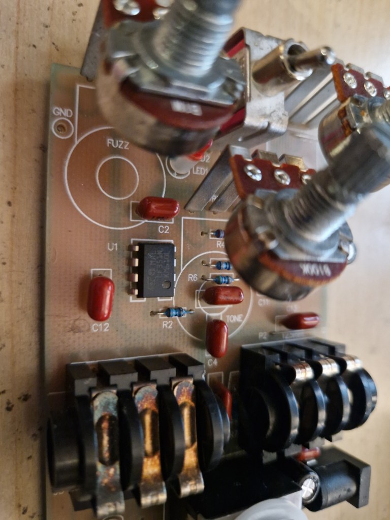 And look, I recognised the pedal. This pedal is a clone of the Robin Tomtlund Red Fuzz, a fuzz I build in my early days of pedal building. You can debate if it is a fuzz or just an overdrive / distortion pedal. It is a popular DIY design and is very well documented at General Guitar Gadgets.