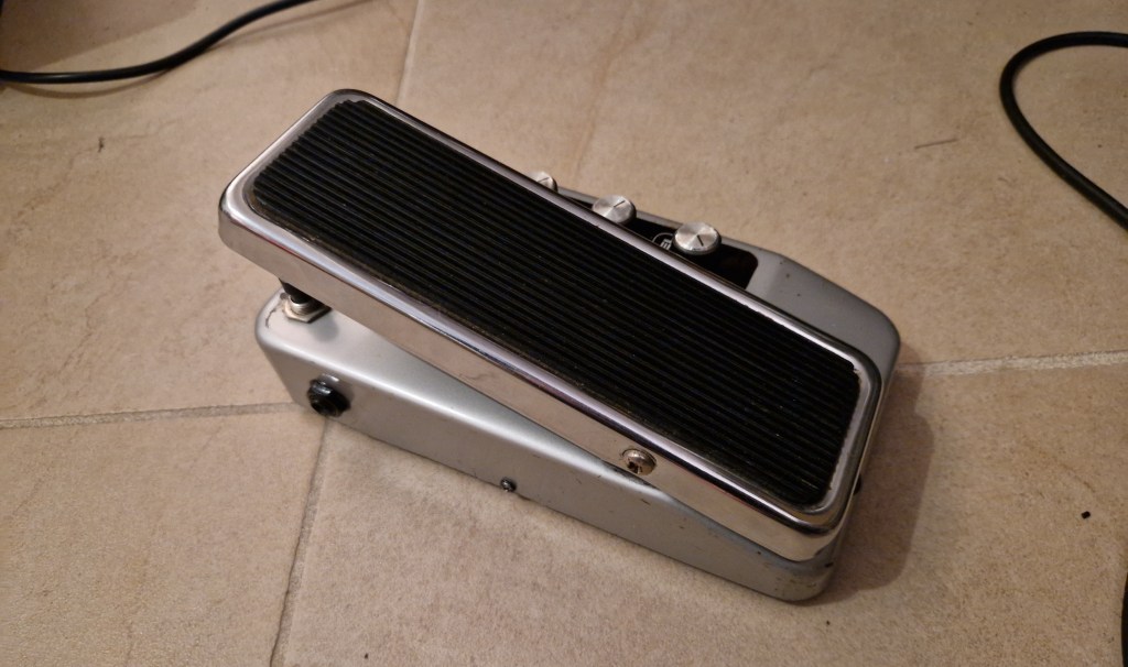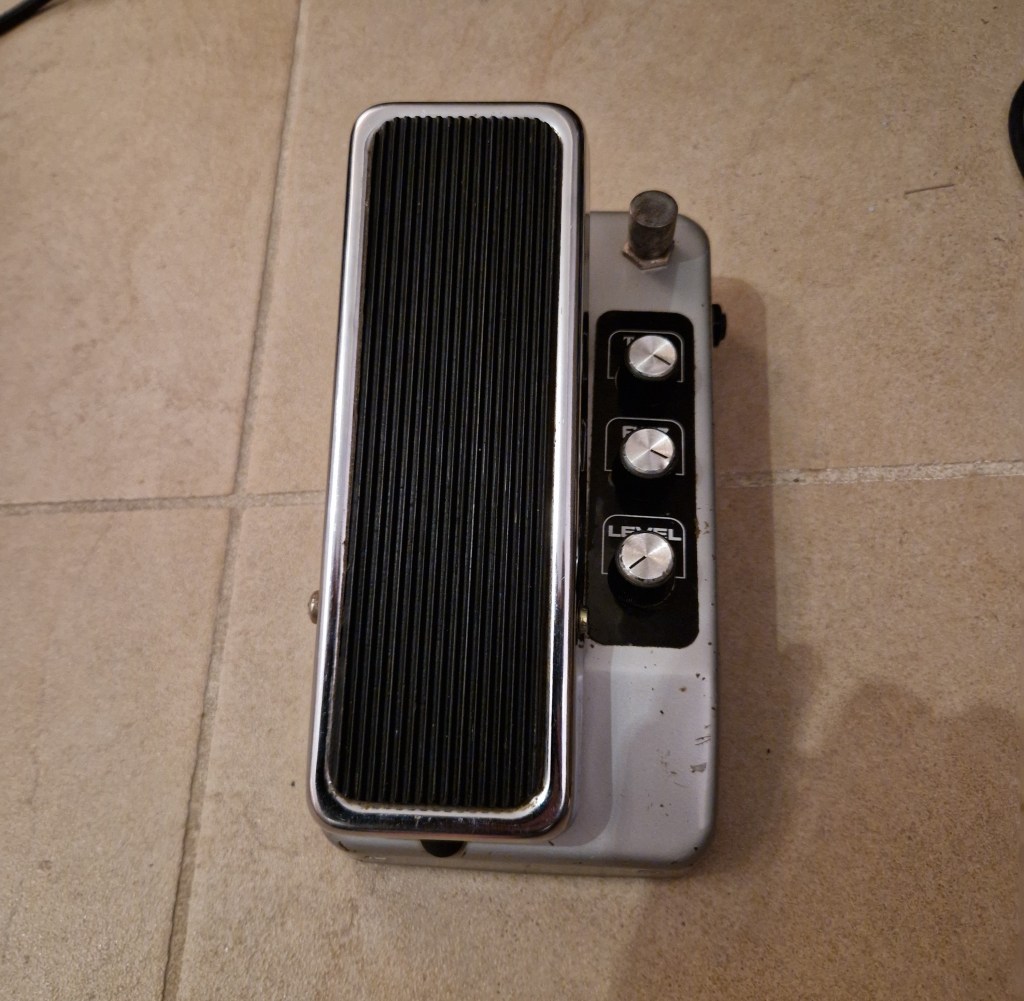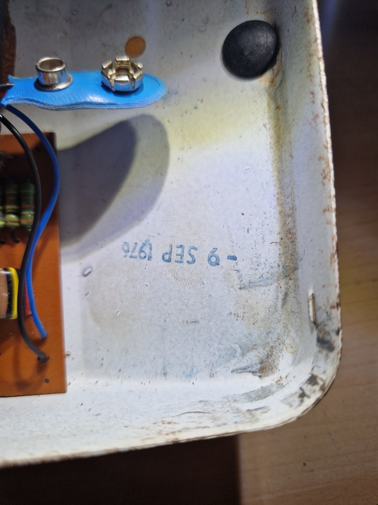 On the inside two seperate PCB’s are located stacked on top of each other. They share a common power supply by the means of a 9V battery. This pedal was made on the 9th of september 1976
