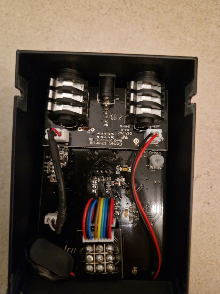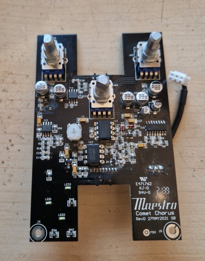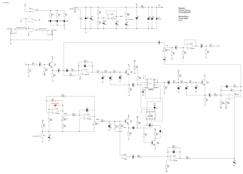 The Maestro Comet Chorus is housed in the known sloped enclore that Maestro pedals mostly use. It has three knobs, one switch and one footswitch. On the inside of the enclosure you can find a trimpot (called ‘Orbit’) and a second trimpot on the other side of the PCB. As you can spot most of the parts are SMD. IC’s are RC4558 build bij TI and the delay IC’s are from Coolaudio (V3207 / V3102 combo). A weird one on the board is a LM13700.