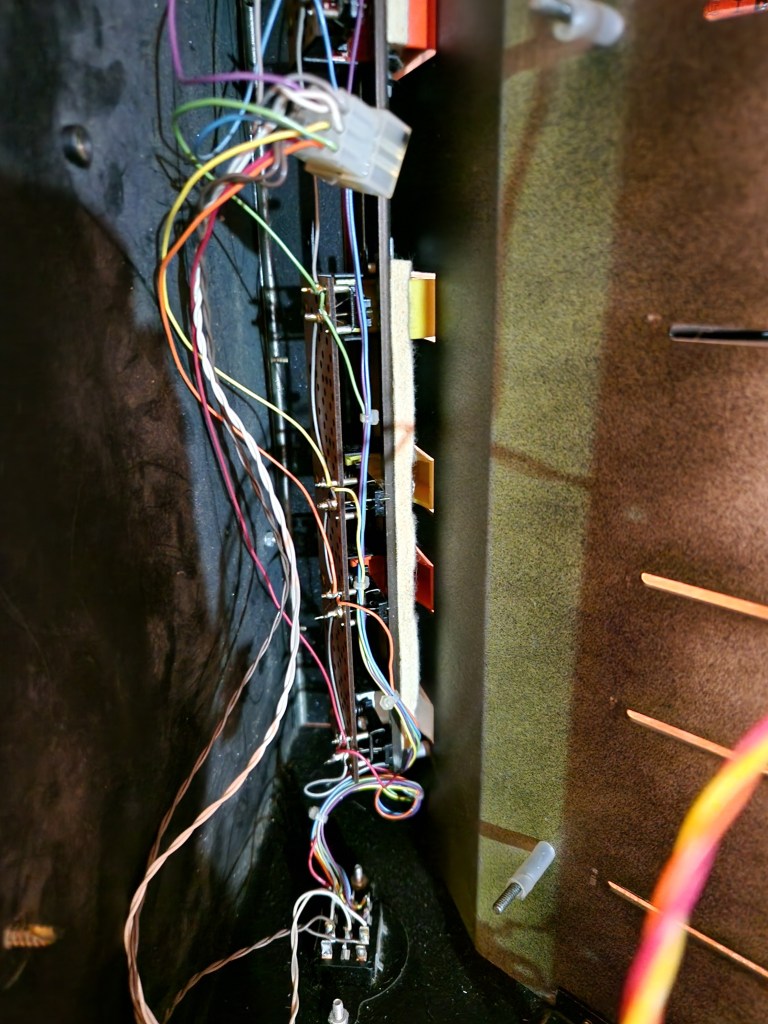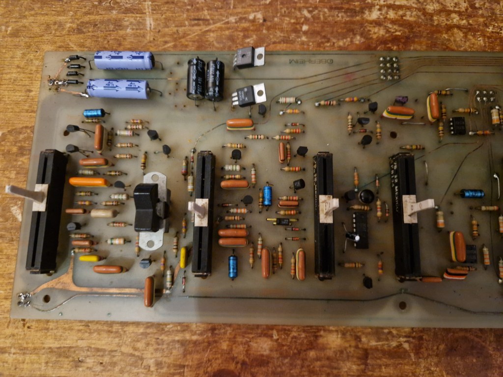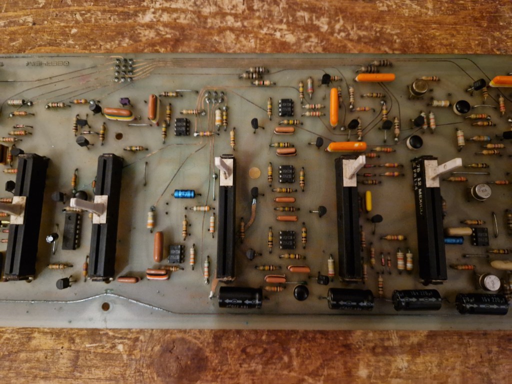 When opened up a BIG PCB is visible on which all sliders and switches are connected to. The main effect switches are located on a different, extra board. All parts are connected by plugs to each other. In this unit some of these plugs were removed in the past maybe due to some product failure. Also the voltage regulator transistor was replaced by a more modern voltage regulation.