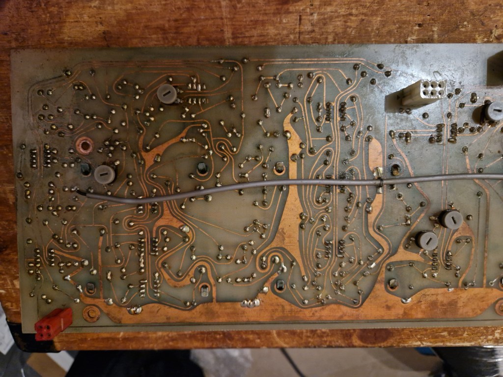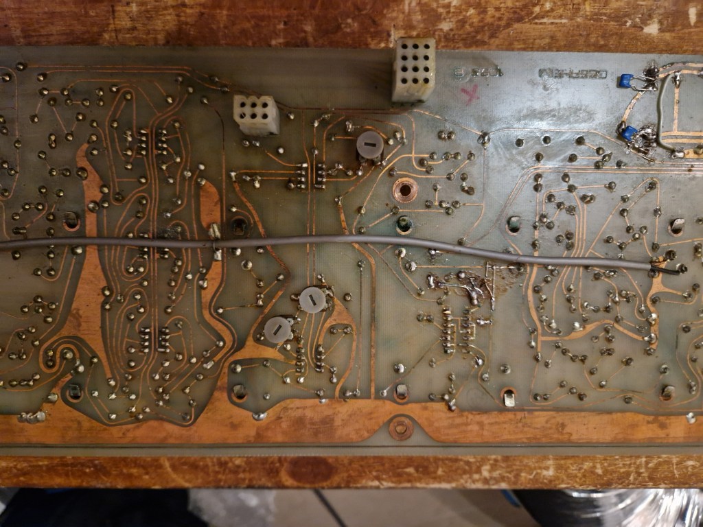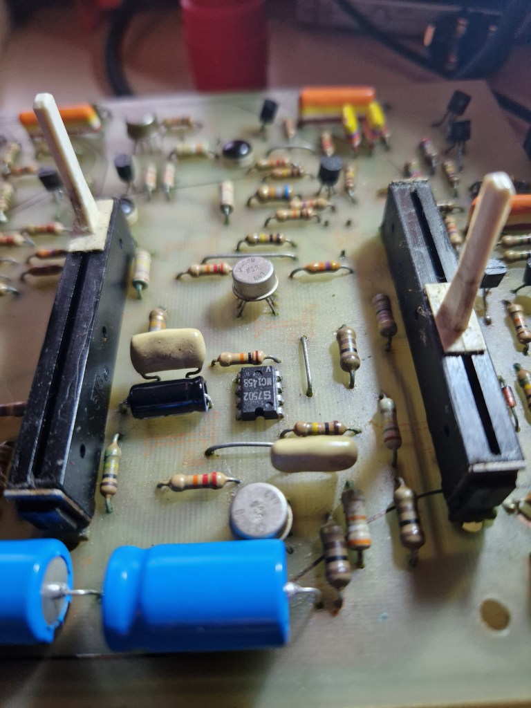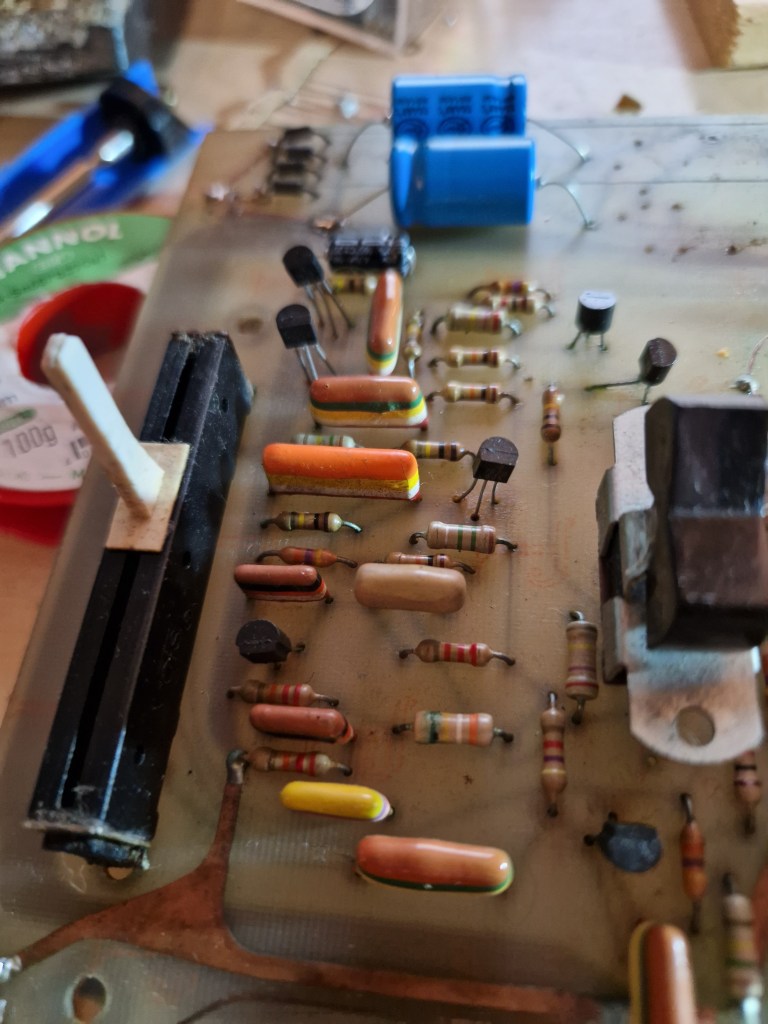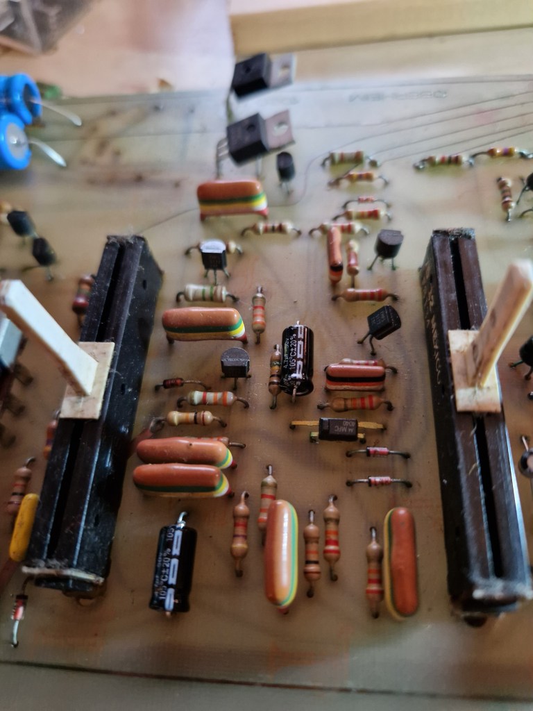 - One PNP transistor (2N3638A) with a very low Hfe (from the datasheet). I tried replacing this one with a modern, higher Hfe version without succes. When I replaced it with the exact same (but working) transistor, the ‘Envelope’ section worked like it should.