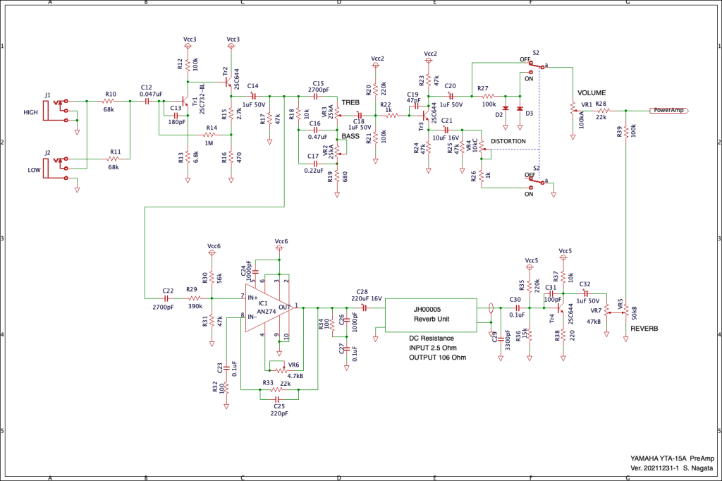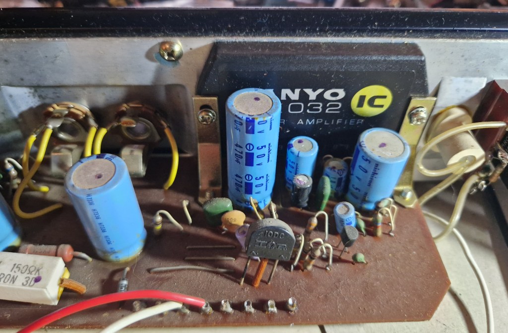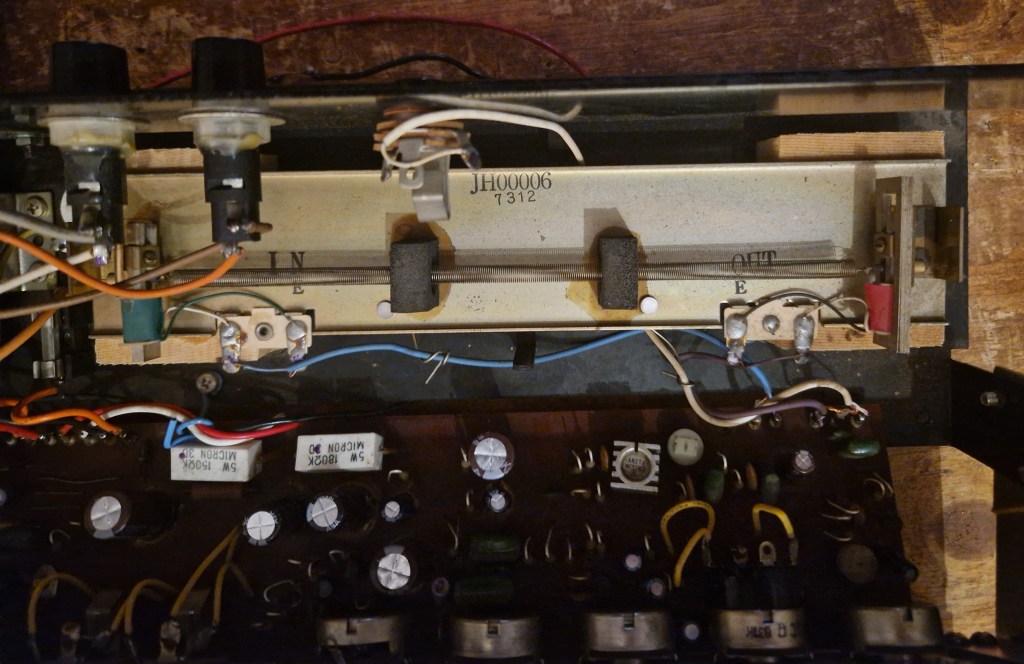 When opened up you can spot the single PCB that houses the power supply and the preamp. The poweramp is a Sanyo 032 IC module (also found as the STK-032 module) that delivers 25W of power from a single unit. The reverb is a single spring reverb tank which is located inside the enclosure. Power filtering goed by a single 2200u can cap. All other filtering is done with radial ELCO caps.