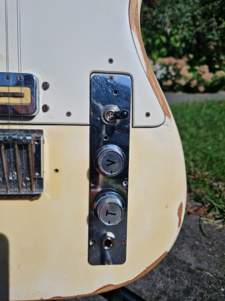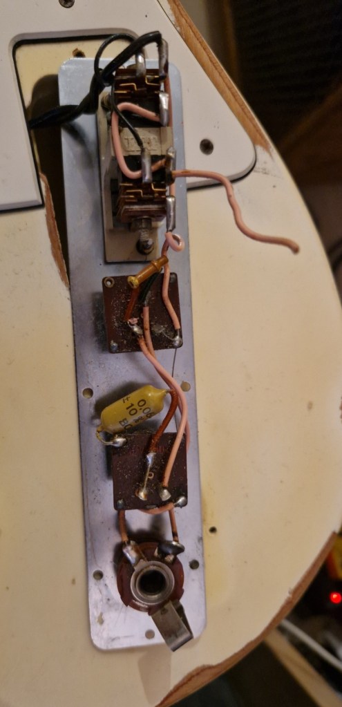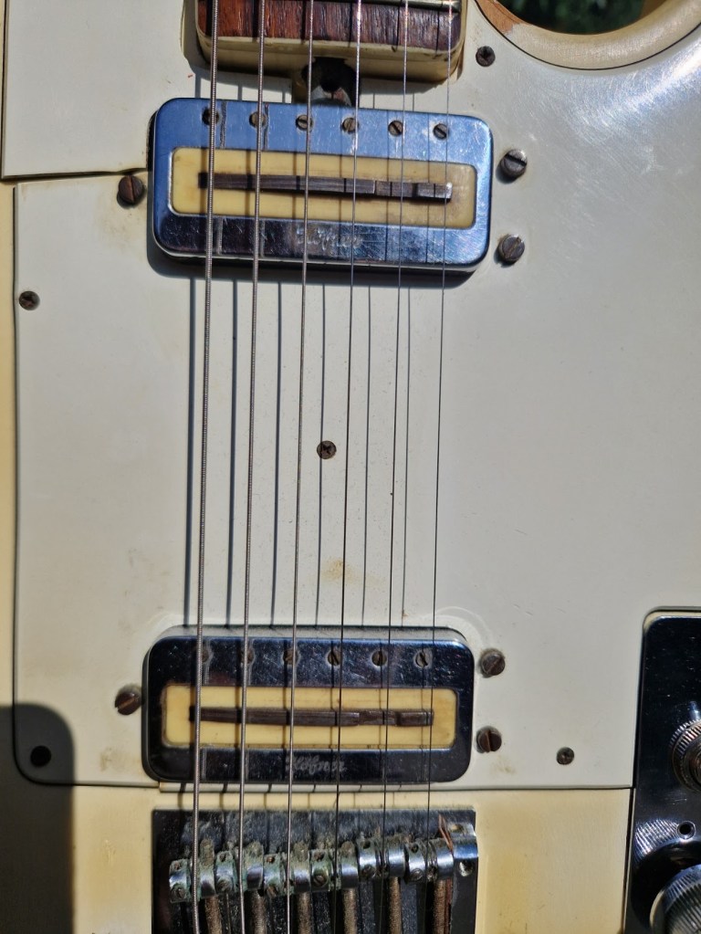 I gave the guitar a cleaning, set the neck up and adjusted the bridge. Lastly, I adjusted the pickups for their height. The bridge pickup is easily overshadowed by the neck pickup. I replaced the pickup selector switch with a new one as the old one was broken. I also swapped the potmeters for some good CTS versions.