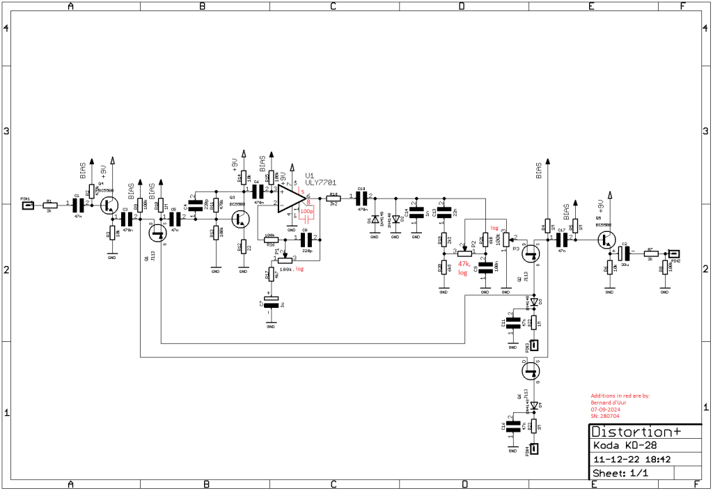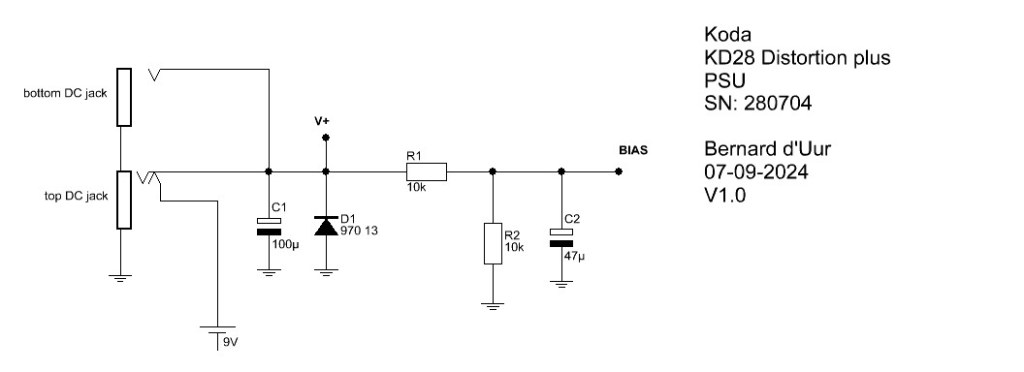 This circuit later changes in the KODA version. Online, at this freestompboxes.org post a schematic can be found of the KODA Distortion Plus. My unit is close to this schematic but still has some differences. I’ve added my differences into the schematic (in red) and added a second schematic of the power supply of this pedal, as it was missing.