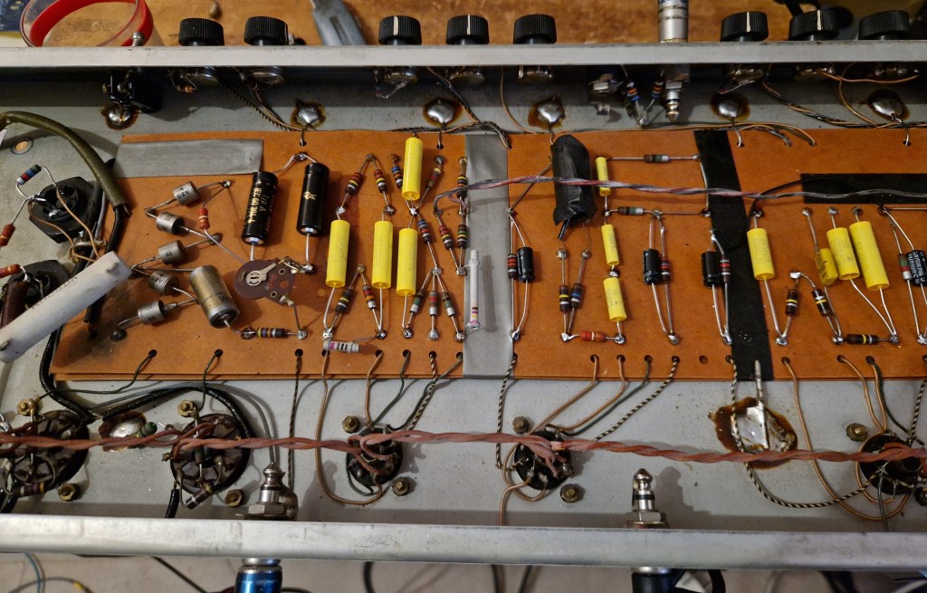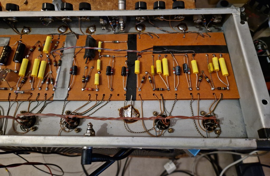 On the inside you can spot a dedicated turret board amp circuit designed over multiple boards. The signal caps were all replaced with other signal caps and the new caps were soldered upon the leftover legs of the old caps. I can’t think of a reason to do so, as you have turrets to de-solder en resolder, so a steady way to mount the new caps is possible. I replaced all the signal caps with good quality signal caps that were soldered upon the turrets. Also the radial electrolyte caps were replaced with axial ones as the radial ones didn’t fit and were soldered upon the resistors. Some of them were already loose. The power transformer was replaced by a new power transformer that was mounted on the outside of the chassis. It isn’t a good fit but it is secure and can do it’s job. The original can caps were already replaced with some good quality replacements.