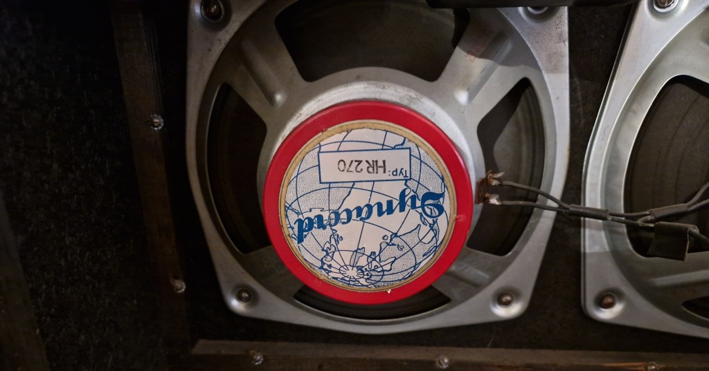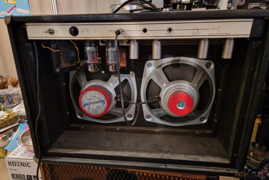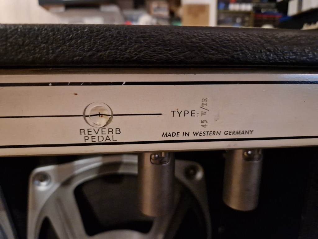 The amplifier that visits my home is marked 45W / TR. I suppose this means the output wattage (45W) and has a tremolo. As you can spot it also has the holes / markings for a reverb knob (and jack) but the unit misses any reverb circuit. I guess that they produced multiple versions of the amp with all different aspects (and maybe price). Speakers are Dynacord speakers; I don’t know if these speakers were original.