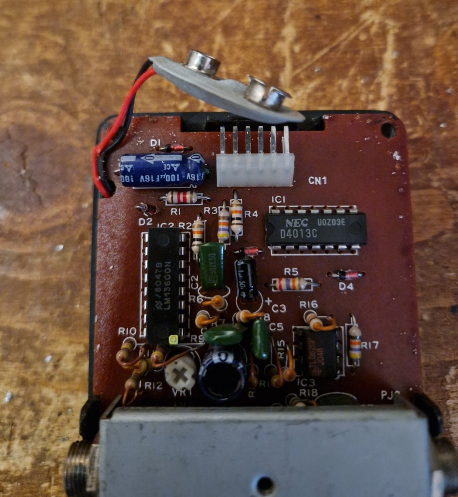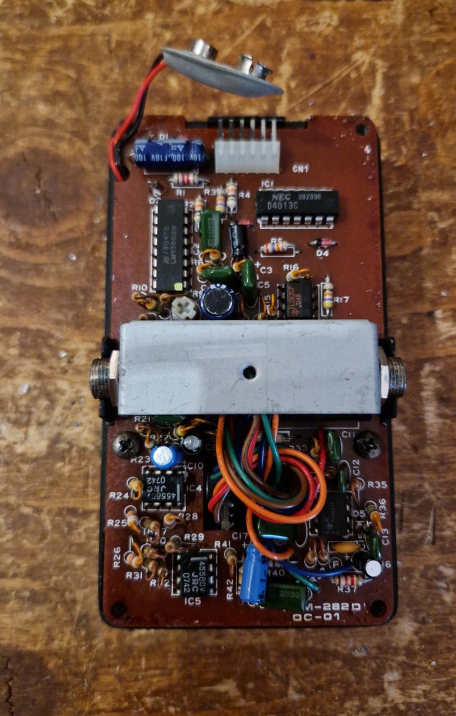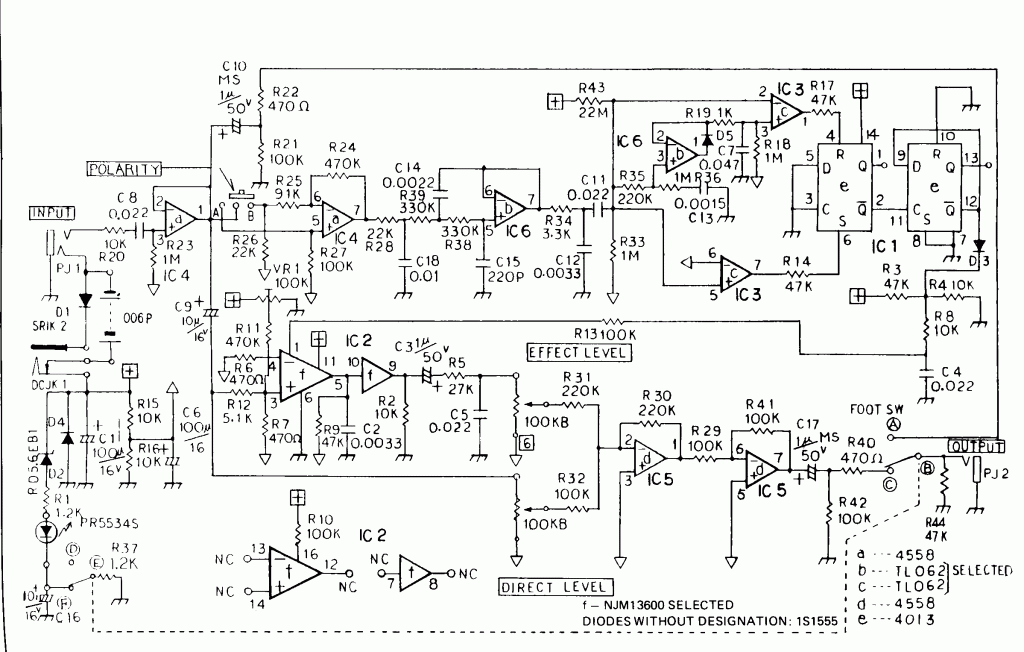 As you can spot on the schematic, the octaver has common Octaver design with a 4013 flip flop design. But where most octavers feed this signal into a FET the Yamaha uses a VCA (LM13600) to add the octave down effect to the mix. This gives a different kind of creation of the octave down effect and thus, a different effect. The ‘Polarity’ switch is located at the beginning of the circuit and determines the phase of the signal that is fed into the tracking part of the circuit. The output of the circuit are two audio lines that you can mix with the dedicated knobs: one for the clean, unchanged sound, (‘Direct Level’) and on for the octave down effect (‘Effect Level’). The footswitch switches the buffered input signal and the effects signal to the output (and the second part of the switch switches the LED on and off) without any FET switching.