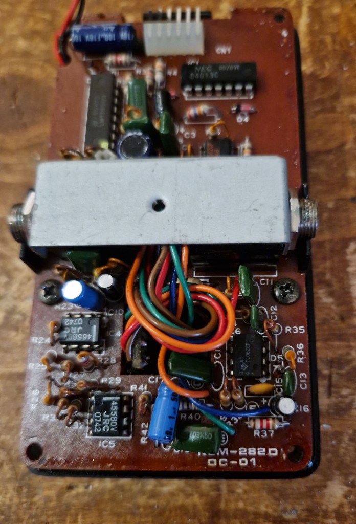Through the backside of the pedal you can reach the circuitboard on which all parts are located. On the back you can locate the connector pins for the PSE pedalboard. No DC jack is available and the pedal can only be powered by a 9V battery. A single trimpot on the circuit determines the BIAS of the VCA (more on that s bit lower).