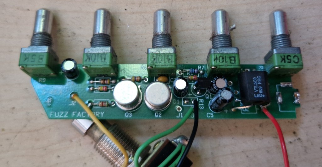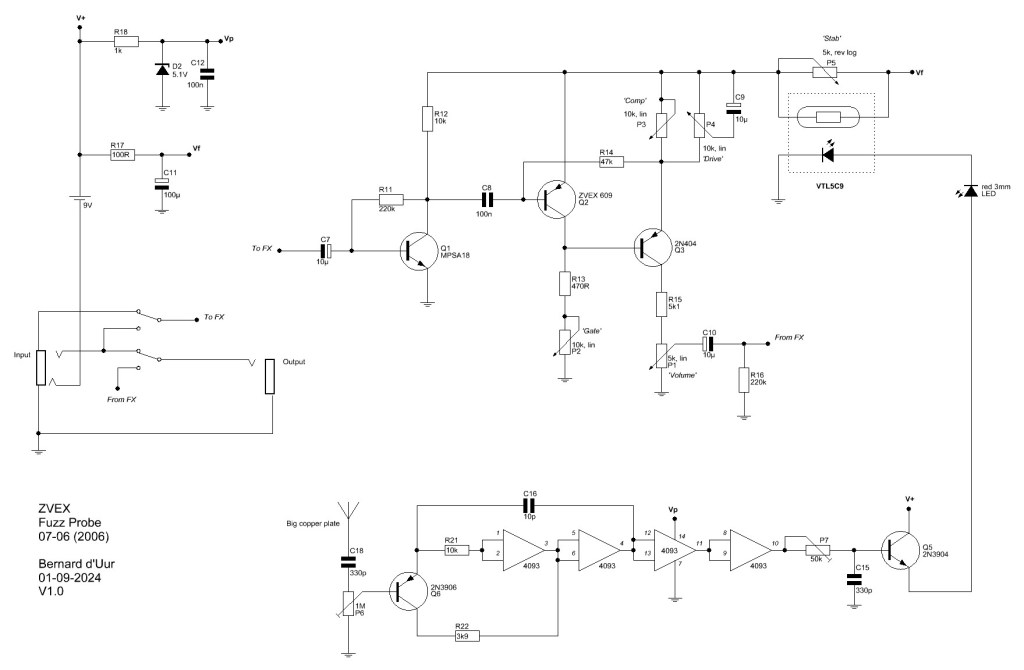 The probe circuit has effect on the Fuzz Factory circuit by a Vactrol (VTL5C9). A small LED was added to the front so you can spot your effect on the probe.