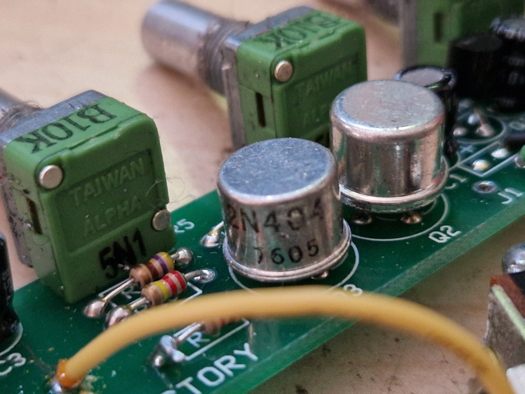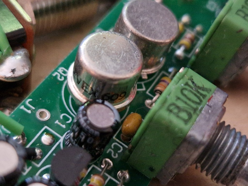 This pedal is similar to the known schematics of the ZVEX Fuzz Factory. The input transistor is a MPSA18; a high gained transistor that is different to the transistor that is often traced into this pedal, the 2N3904. The germanium transistors look exactly alike but are noted differently; one is a ZVEX branded ZVEX 609 transistor, the other one is a 2N404 transistor. The 2N404 is a known PNP germanium transistor that is often found in commercial Fuzz pedals. I wrote on it a while ago when discussing the Fuzz Face clones from the cheap pedal companies as can be found here. As both transistors look really alike, and the 2N404 was still in production at that time, I guess that this is the ‘Mystery’ transistor (sometimes rebranded) that can be found in Fuzz Factories.