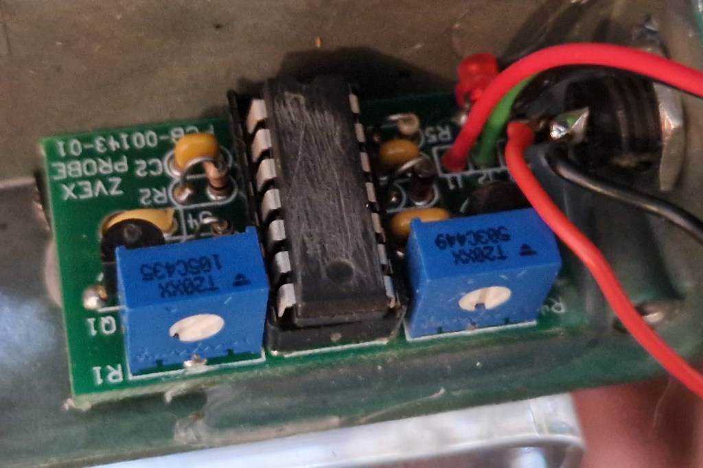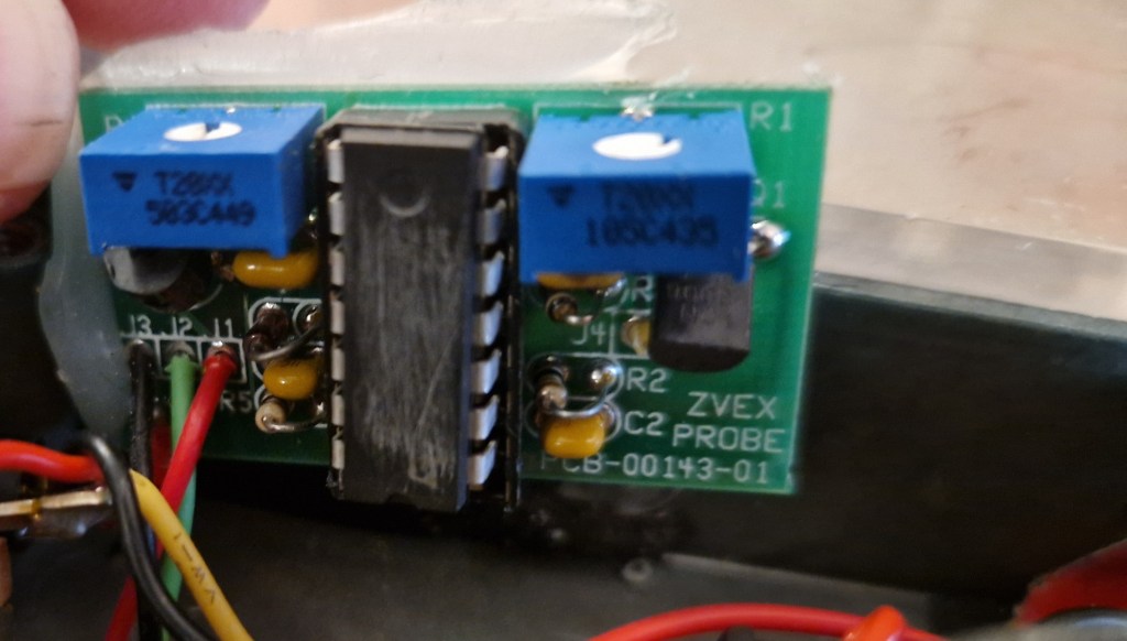 The probe circuit follows the schematic I traced a while ago when tracing a different version of the Fuzz Probe. This version didn’t have the markings on the IC sanded down, something you can spot in this version of the probe. Two trimpots set the inner working of the probe and can be altered by the holes in the bottom of the pedal.