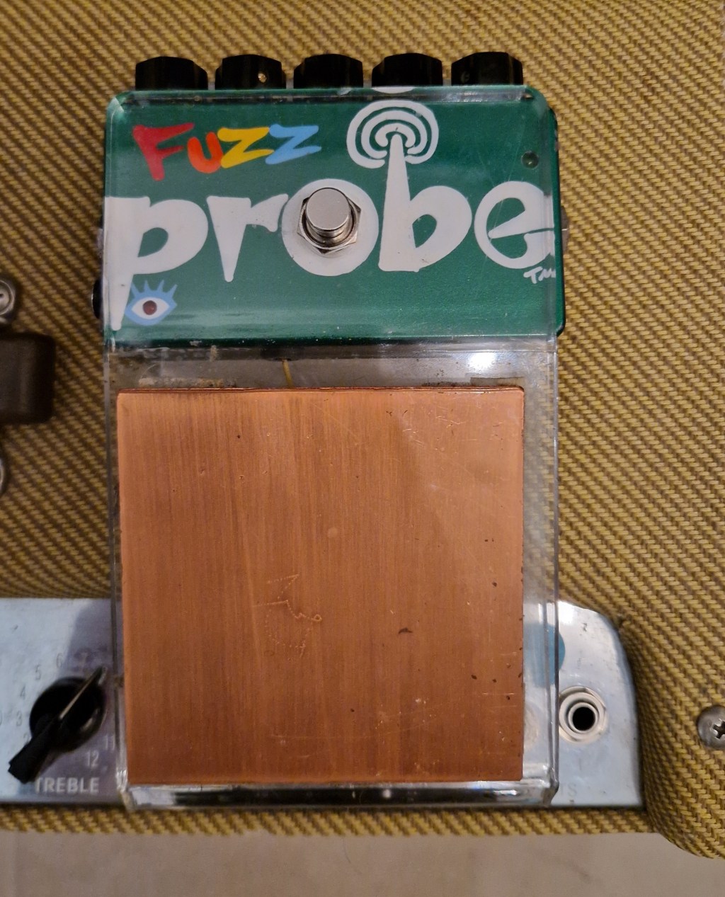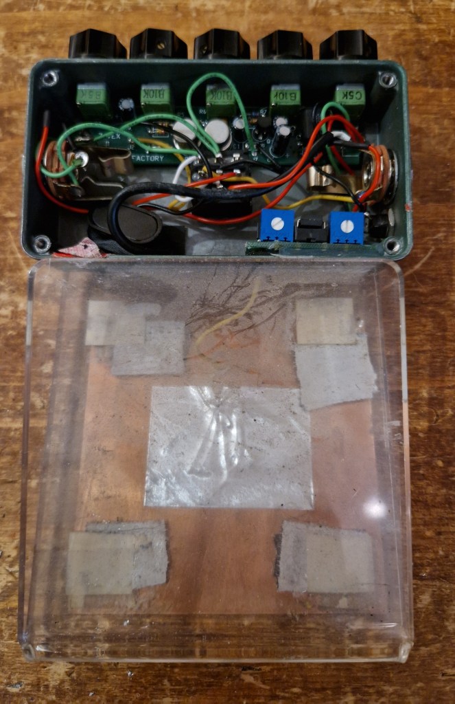Then the probe was added. In the off position (not touching the plate) this extra probe has some control on the sound of the Fuzz Factory. The overal sound of the fuzz is much more tamer compared to my other Zvex Fuzz Factories. I notice this most in the ‘Stab’ function. Where the ‘Stab’ function on my other units are ‘uncontrollable’ and wild, in the probe version the ‘Stab’ is much more controlled and tame. It adds much more control to the effect and shape the sound of the fuzz but at the same time the wildness of the effect was such a nice feature. The probe adds a lot more versatility to the fuzz pedal as it controls the ‘Stab’ function by touching the plate. Also hovering over the plate with my bare hands do something and with the right setting of the ‘Stab’ knob you can control the height of the pitch by closing in on the plate or moving away. The added LED lets you see the effect of your touching: hovering makes the LED glow dim and touching turns the LED on full. Clothed the plate function too but the max effect can be gotten with bare hands or feet. Adjusting the trimpot on the underside adjust the way the plate responds to that touch and how much effect is should have.