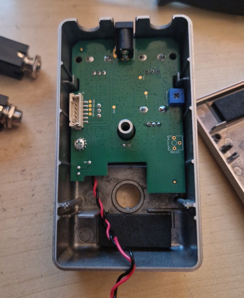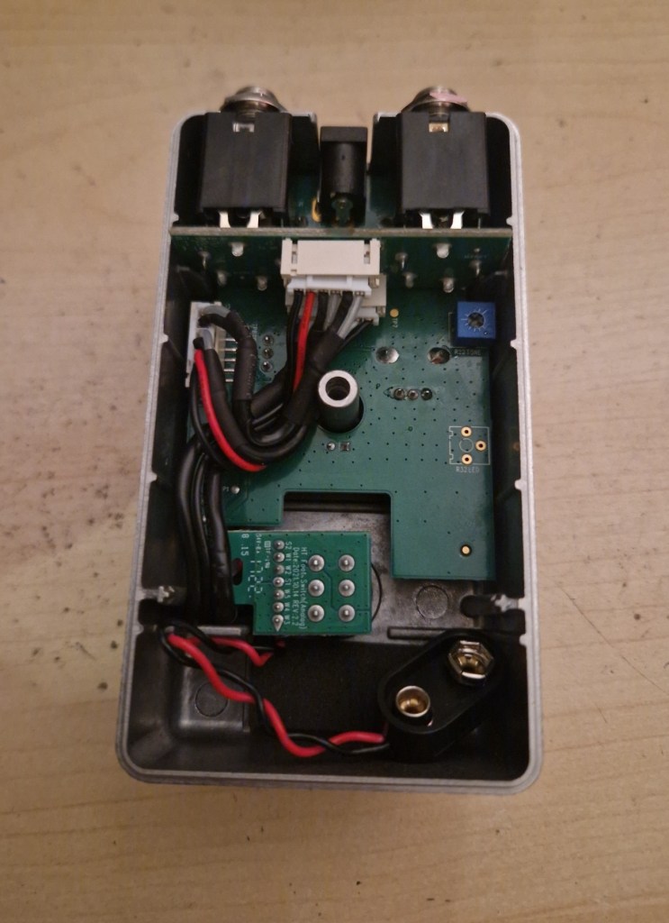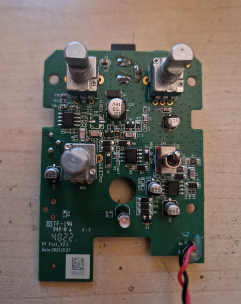 Opened up you can spot three PCB’s (jacks, fuzz effect and bypass switch) that are connected by (shielded) wires. The PCB’s are pretty well made with all SMD components. All SMD parts are of a rather small build making it impossible to take readings from the front.