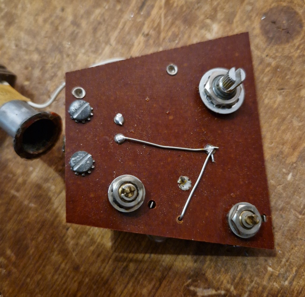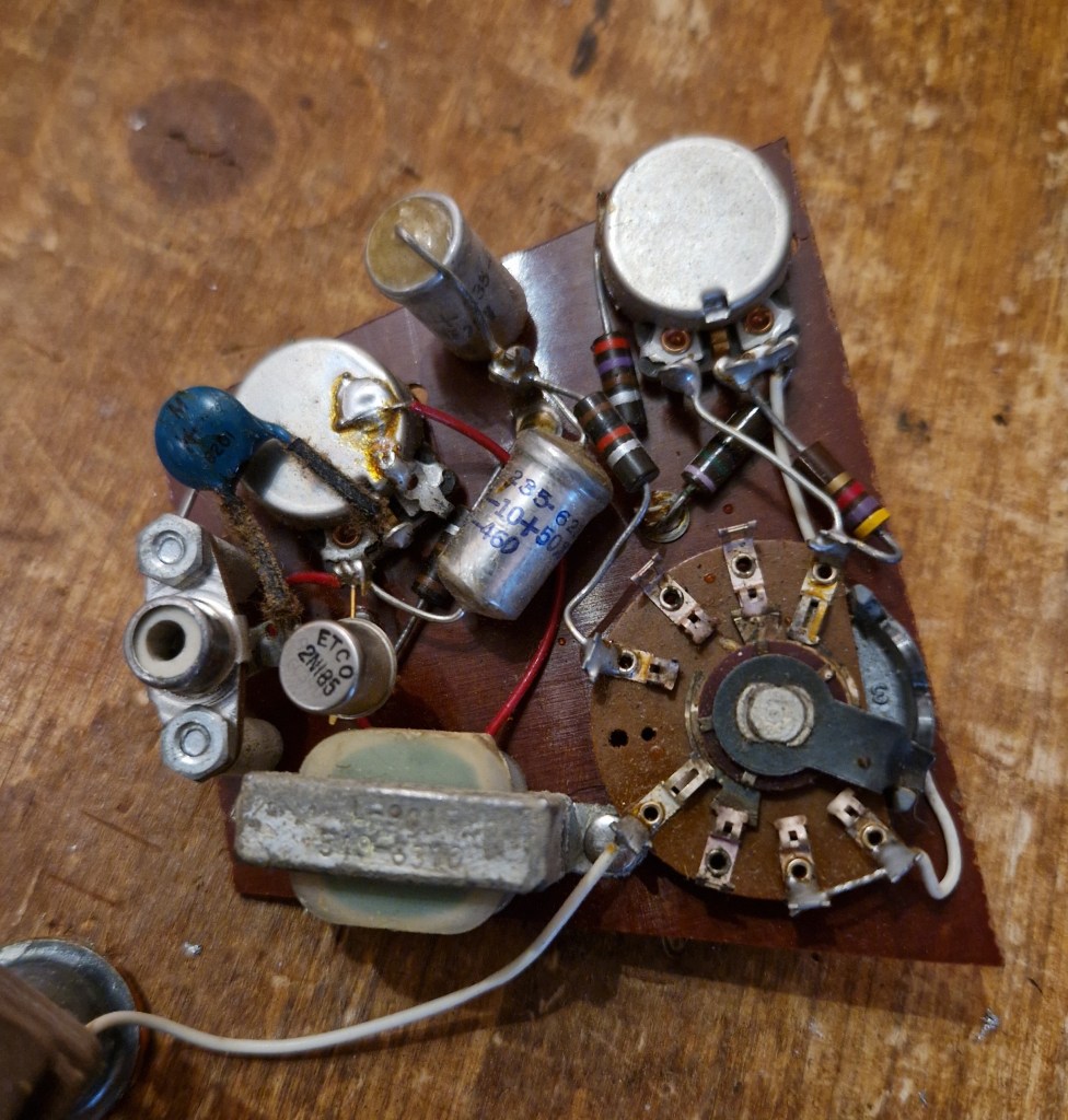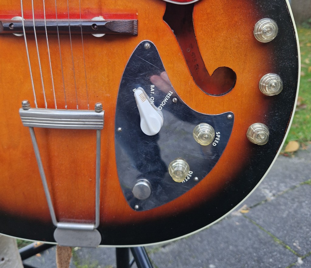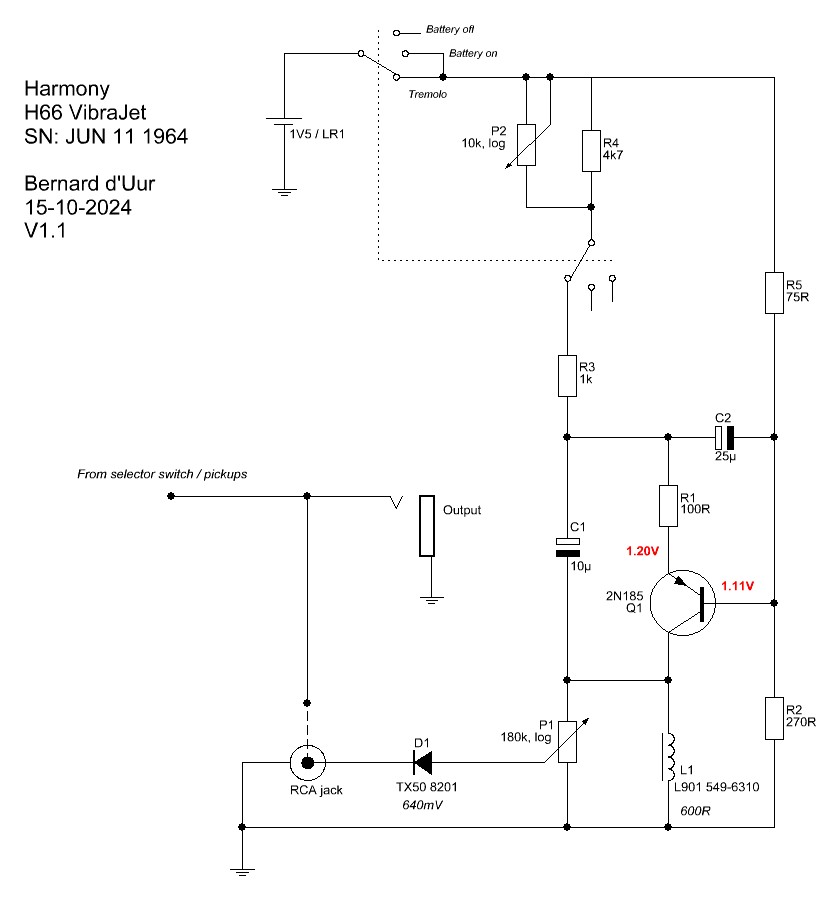 As you can spot the effect uses a single Germanium transistor and a 1,5V power supply to produce the tremolo effect. The transistor and the inductor creates an LFO that through the diode creates a volume decrease effect. The effect sits parallel to the audio line of the pickups and has little to no effect on the output tone and volume when bypassed or turned on. When this guitar came in the switch was accidentally set to the ‘Battery on’ position in which the battery was drained to 1.1V. In this situation the tremolo functioned normal, only the amount of depth from the effect was less compared to a full battery. The effect is more potent with the bridge pickup compared to the neck pickup.