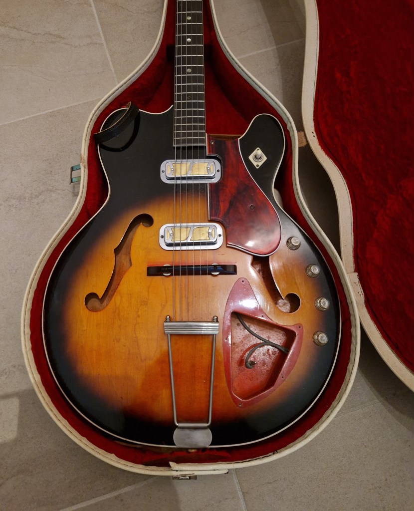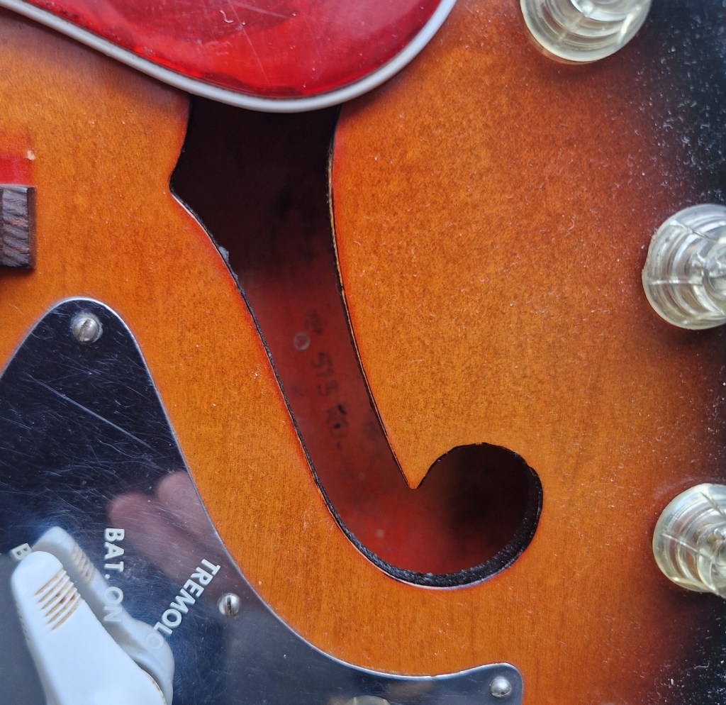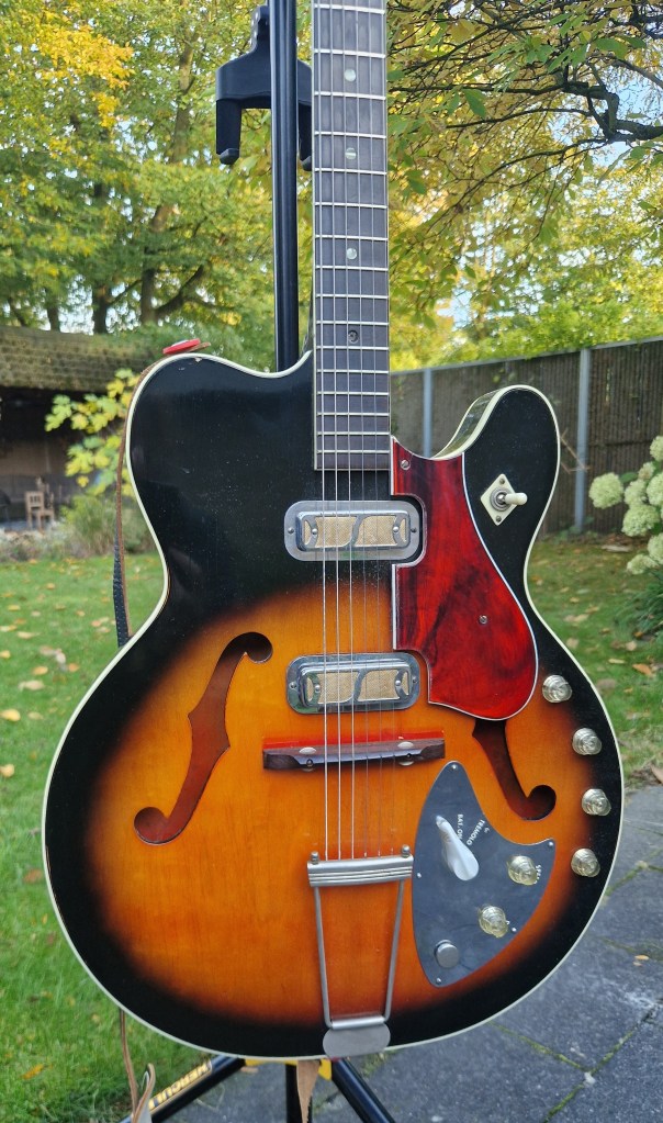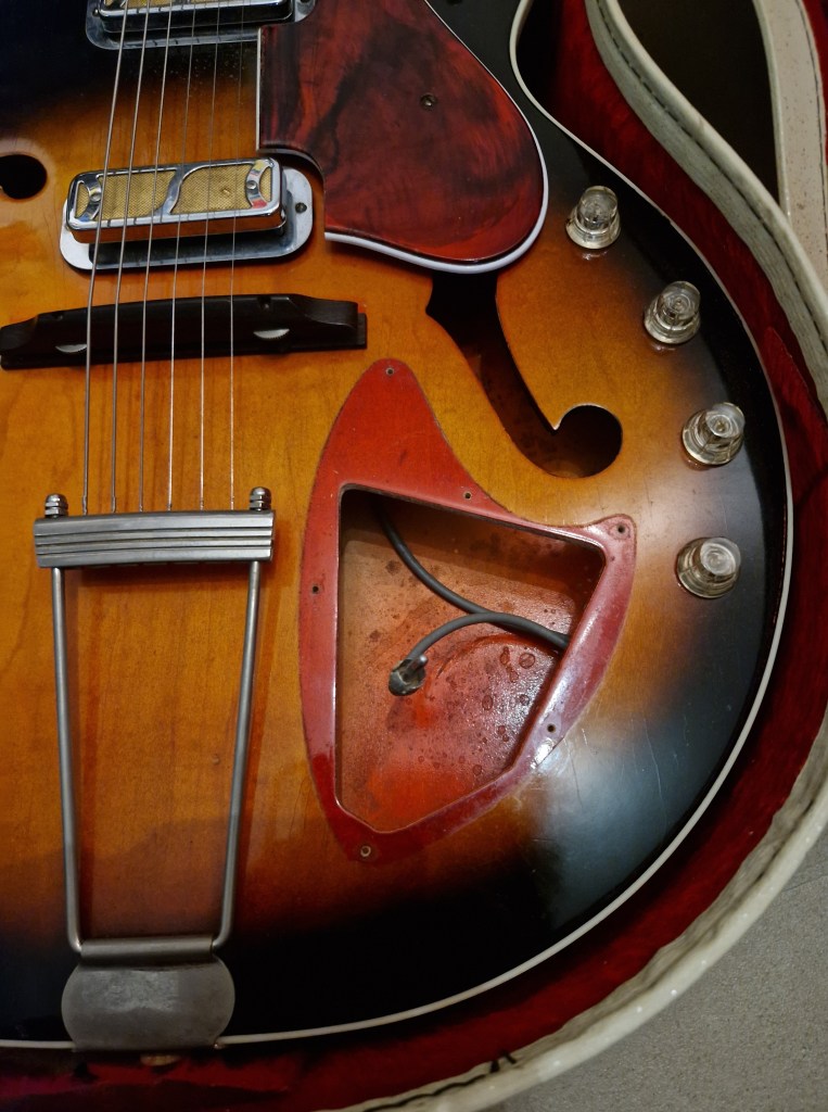 This guitar sounds incredible. Acoustic, with no amp, the guitar sounds full, loud and responsive. And when an amp is added this sound is even elevated to a new level. The guitars sound is responsive and clear. The DeArmond Gold-foil pickups give it a very specific sound that suits the guitar and the player. I love the openness of the sound and the amount of body this pickup gives the sound even in the bridge position. The bridge pickup is clear, loud and has a lot of push that I don’t recognise from such a small single coil pickup. The bridge pickup is more even sounding with a lot of body and volume. Both pickups are quite loud and enhance the natural sound of the guitar. The dynamics of this guitar is what most suits me in such an instrument. As it is fully hollow it responds to everything that is happening; from attack of the strings to the distance to your amp and the way you hold the neck. I personally missed a Vibrato bar to complete the sound of this masterpiece.