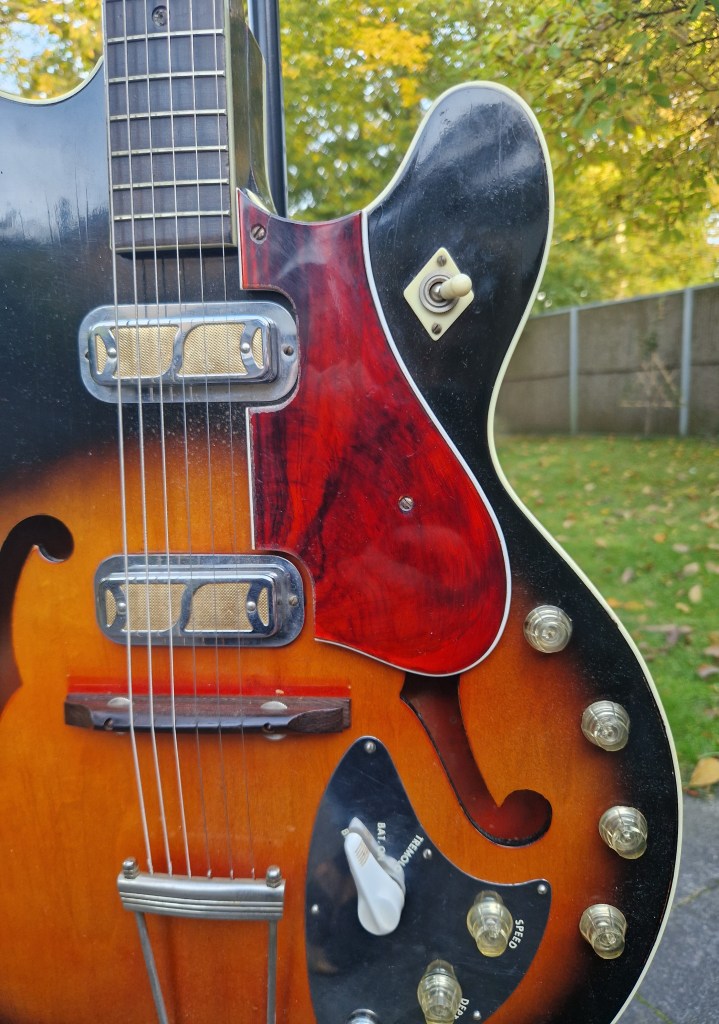 This guitar is a beauty. Equipped with two DeArmond Gold-foil pickups both with individual volume and tone controls and a single selector switch you can control the sound from both pickups to the max. Both tone knobs are 250k and the volume controls use a 1M potmeter. The tone caps are different between the pickups; the neck pickup uses a 22n cap and the bridge pickup uses a 100n cap. These two values differ due to the bass-ness of the pickups’ placement on the body. With these values the filter this cap creates is lower (in frequency) on the bridge pickup compared to the neck. I enjoy using these different values for the pickups although I noticed that usually I just turned the tone knob to fully open.