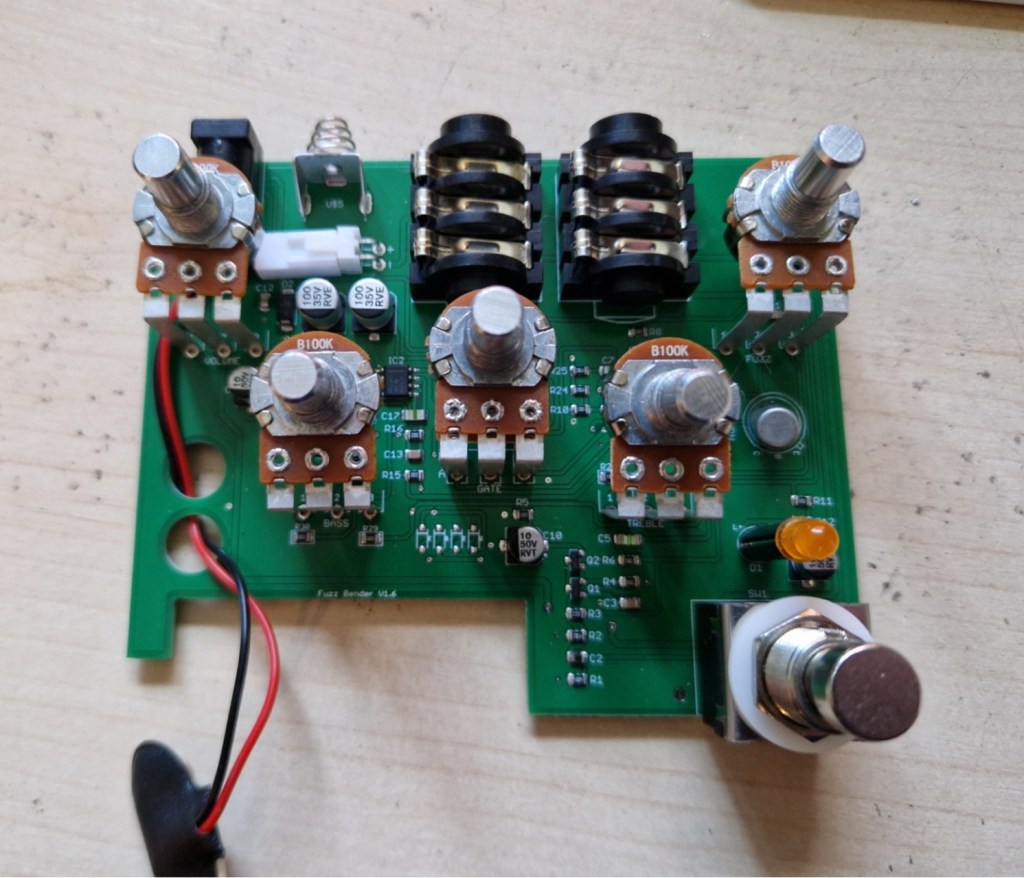 As you can spot the pedal is a nice recreation of the Sola Sound Tonebender MK III with part silicon and part germanium parts to make it sound low noise and good fuzzy at the same time. After the fuzz pedal a tone stack is added build around two gyrators; these gyrators add a parametric kind of EQ for ‘Bass’ (100Hz) and ‘Treble’ (10kHz).The ‘Bias’ knob gives you stability around the Germanium transistor and the following stage. The power supply is build around a LT1044 charge pump to create 9V and -9V around a single +9V power supply.