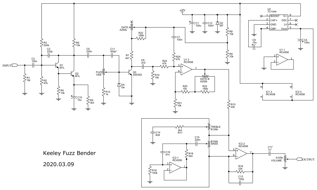 On this post on freestompboxes.org they released a schematic of the pedal. The post is a good read upon the pedal and shares some insight. I’ll post the schematic here for information purpose only. I did not create the schematic but will use it throughout this post to make parts clear.