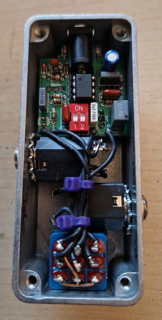 The pedal follows the known schematic of the Menatone Red Snapper. The IC is unknown as the print were sanded down. The DIP switches add one or two caps to the second opamp stage changing the character of the pedal. As you can spot both the ‘Gain’ and ‘Bite’ knob changes the gain of the pedal in their own way. Combining both can give you different kind of gainsorts and sounds. As you can see this pedal was inspired by the Boss OD-1 that has only a single overdrive knob.