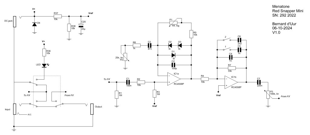 When I started to engage in understanding effect pedals, one of the first pedals I ventured in was the Menatone Red Snapper. A friend of me had the original version that had a broken switch. Before this specific pedal I did small repair work by replacing switches and potmeters but never tried to draw a schematic or try to understand how stuff worked. Most of the effects that came by already had some schematic written down on the internet. The Red Snapper though was new in 2001. I became interested!