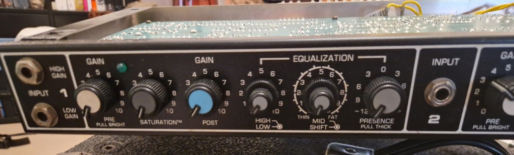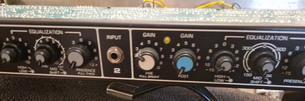 The left preamp is the clean or Un-Effected preamp with controls for gain (‘Pre-Gain’), saturation (an invention of Peavey that adds clipping without altering most of the sound), preamp/ master volume (‘Post-Gain’), a dedicated EQ section with high, low, parametric mid control and a Presence control. The Pre control can be pulled to engage the bright function and the Precense control can be pulled to get a mid boost. You can use this preamp by plugging into Input 1 and this preamp has a green LED. The reverb also works on this preamp.