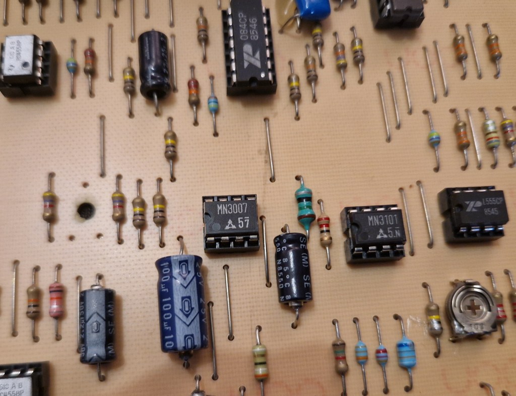 Both effects feed the same chipset to add an analog chorus to the signal. The Chorus rate is done with a regular LFO as can be found in conventional chorus pedals and the Vibrato rate is doen with a specialised IC (8038) to feed a high frequency LFO to the chipset. The chorus-sound is made with a MN3007 IC combined with a MN3101 IC.