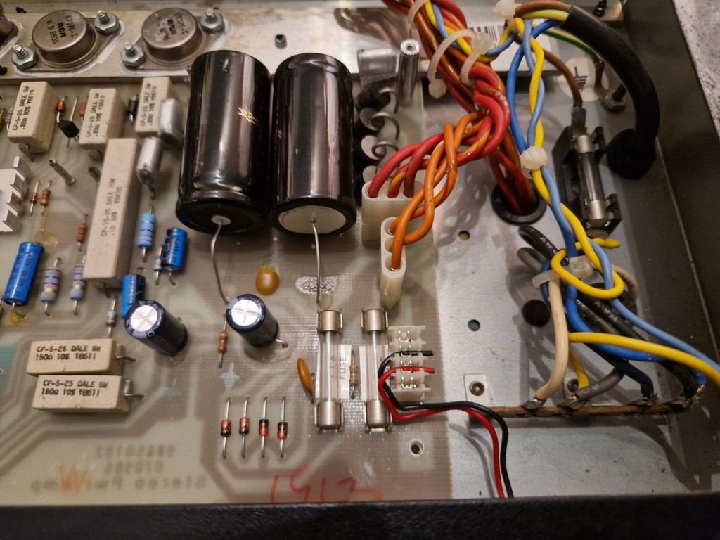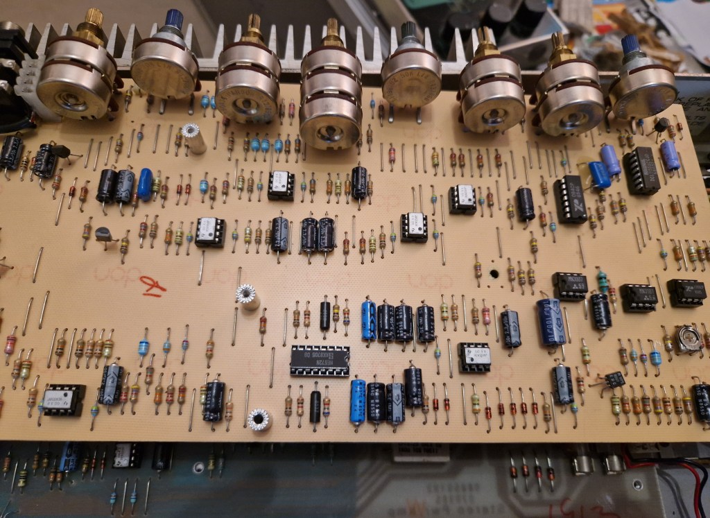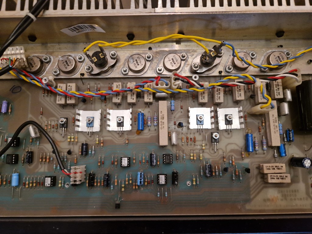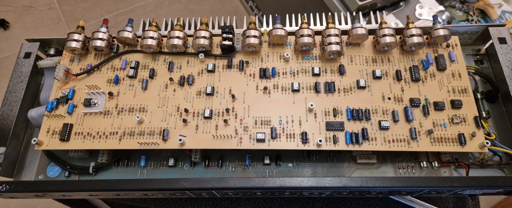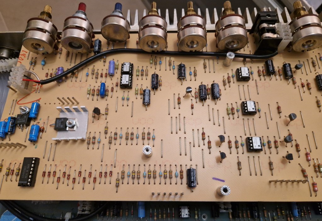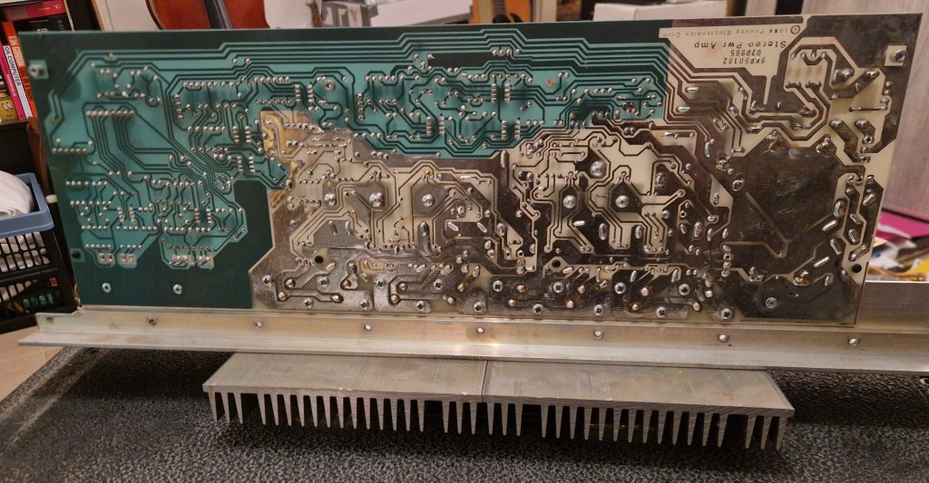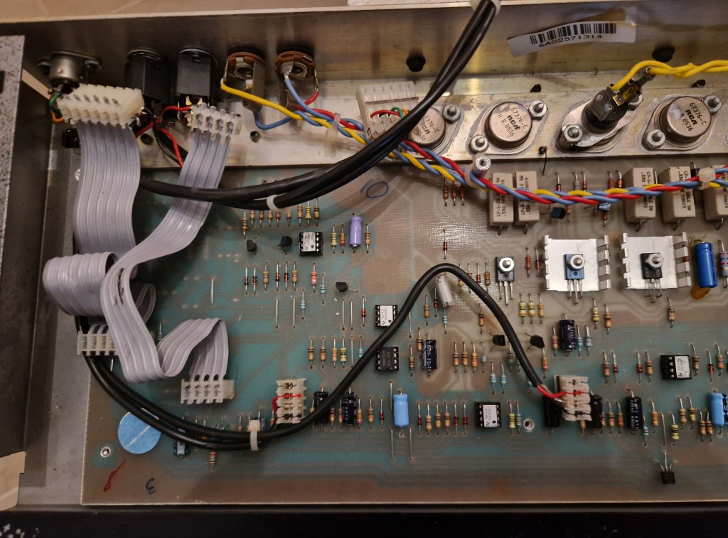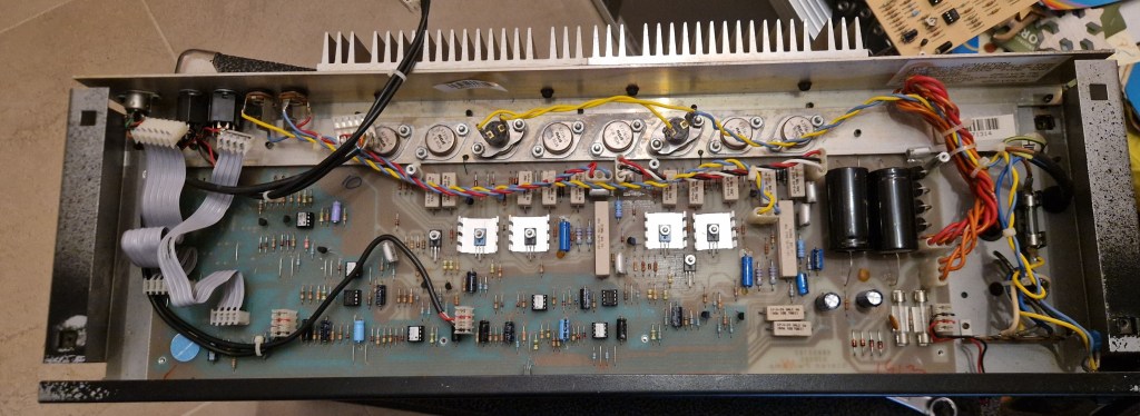 On the inside of the amp two PCB’s make the amp. One PCB on top is the preamp PCB that has all the circuit for the preamp and the effects. The lower PCB has the individual poweramps, the power supply and the switching boards. A big heatsink on the back takes care of the cooling.