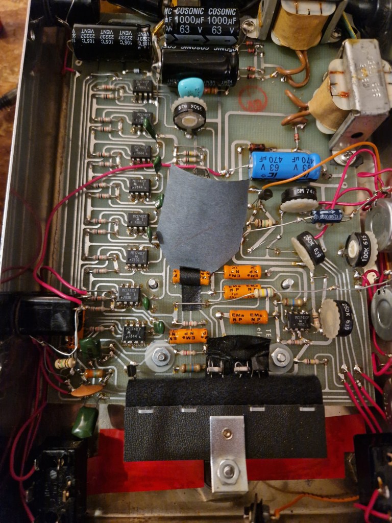 When the pedal is opened a big PCB stares at you. The whole inside of this big pedal is filled with a HUGE PCB that is filled with op-amps, big caps and as you can spot a lot of trim-pots.