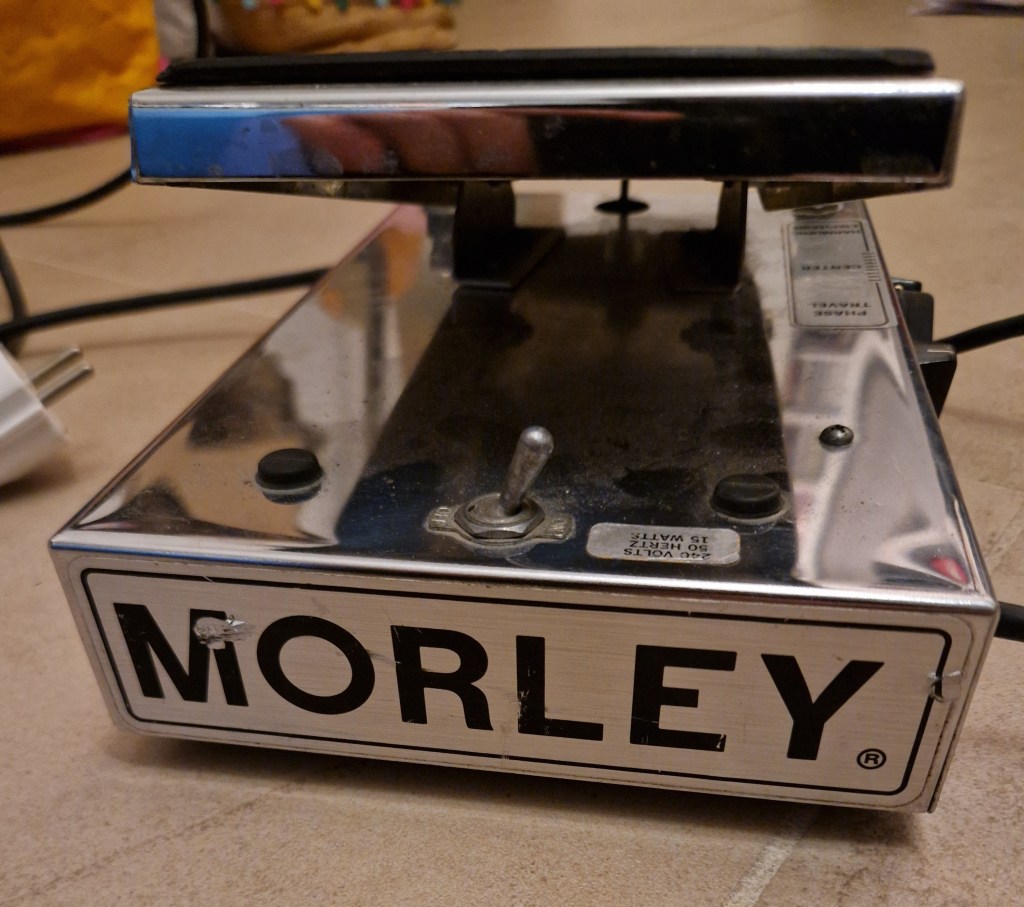 The pedal is housed in the known big chrome Morley pedal enclosures with a big threadle on top of it. The pedal has an AC plug on the side. A sticker on the pedal makes sure it was designed for 220V operation. A switch on top of the pedal turns the AC power on. When turned on a light on the heel position of the pedal is lit. The pedal has three knobs, a big threadle and two footswitches. The right footswitch switches between bypass and phaser sounds. The left footswitch switches between Auto-mode (an LFO is added to the phaser) and Foot-mode (you can control the sweep of the phaser via the pedal). The big threadle on top controls the speed of the LFO in Auto-mode and it controls the sweep in Foot-mode. The three controls on the side are for depth of the effect (Phase Travel), symmetry of the LFO (Center) and amount of feedback in the phaser effect (Harmonic Emphasis).
