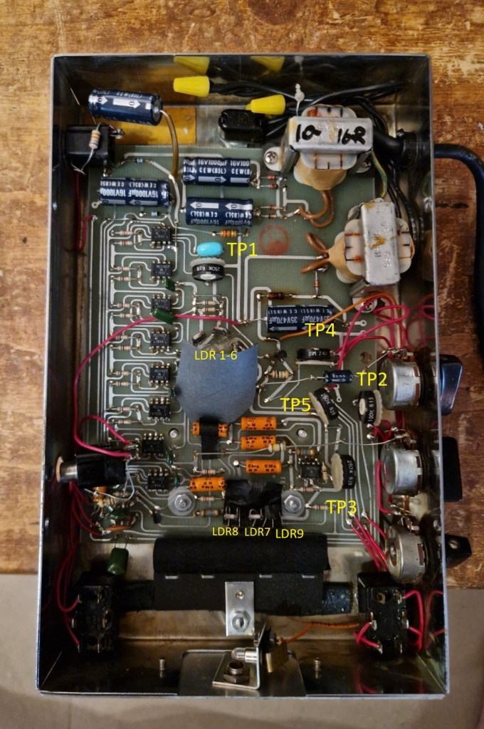 The phaser is a six stage phaser with LDR’s (light dependent resistors) to control the frequency of the filters. The LDR’s are all located around a single light-bulb; extra light is shielded away from the LDR’s by a light shield. The light-bulb that controls the LDR’s is controlled by a circuit that changes the intensity of the light-bulb in the way the mode switch is set. This pedal has two modes:
