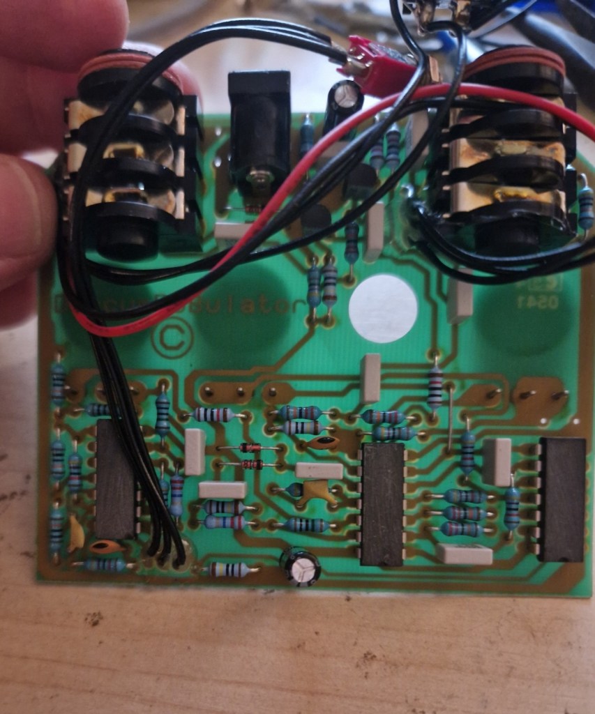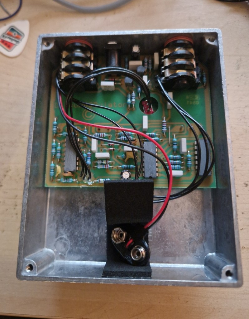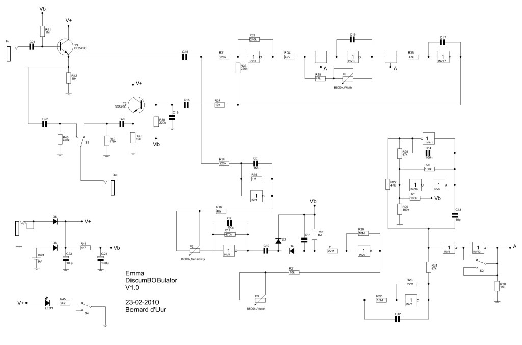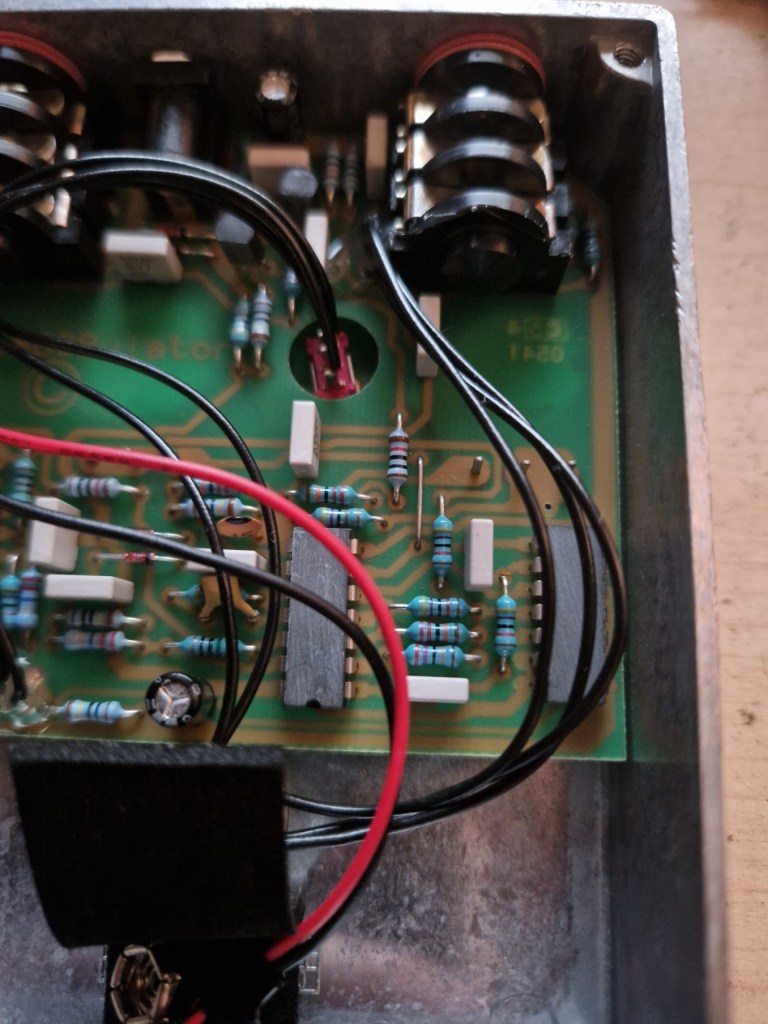 - The fixed resistor across the second inverter was replaced by a potmeter giving you control over the feedback in the pedal. This is made into the ‘Width’ knob