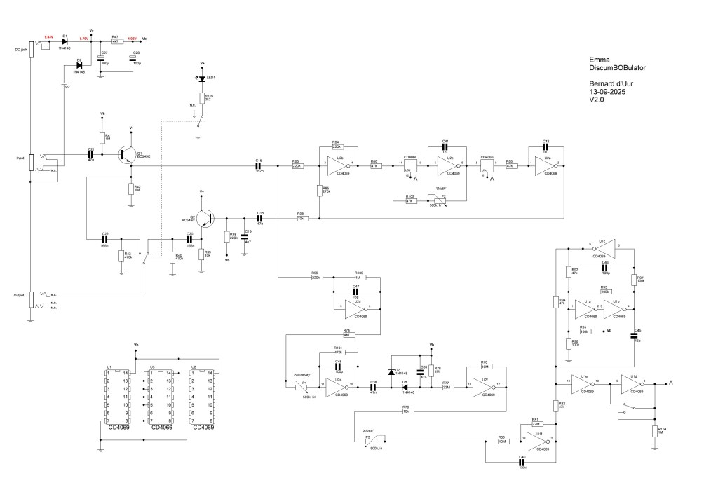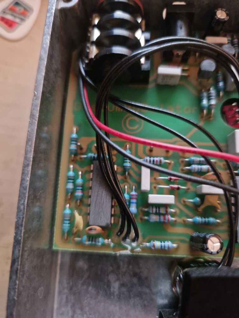 - The unused inverter (two CD4069 IC’s give twelve inverters; only eleven inverters were used in the MXR and one was connected to V+ to stabilise the unused one) was used to give you the ability to switch the drive of the pedal.