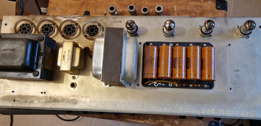 With the amp opened up you can spot the beautiful blue mold caps, the dual cathode electrolytes and the push back cloth wires. The inside of the amp looks pretty standard for 196X Fender amps. Underneath the doghouse five 22u / 500V electrolyte caps are available. On the sockets of the powertubes turrents were located to give extra strength to the different pinout of the original 7355 tubes; I don’t know if these turrents were common as I can hardly find any gutshots from 7355 tube equipped Fender amps.
