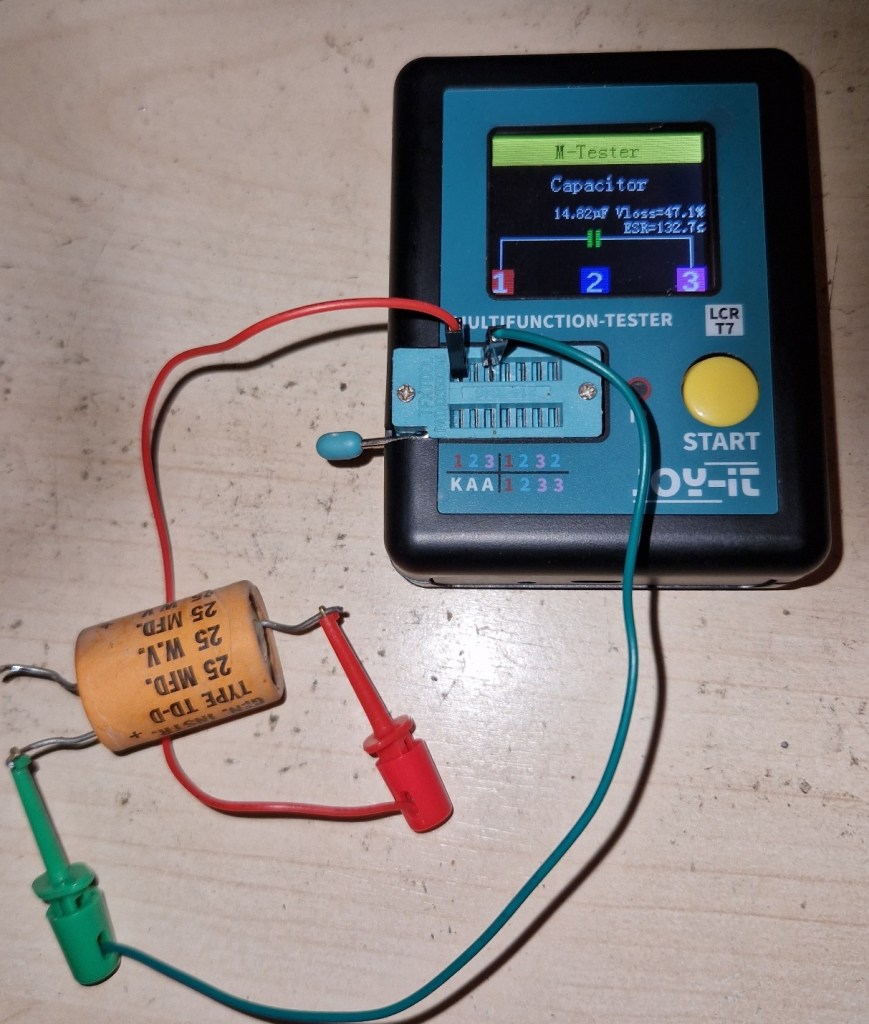 When the amp came in the amp sounded dull, lifeless and really compressed. Opening up the unit revealed old electrolyte caps with signs of leakage. Measuring them with a dedicated tool brought that these caps were not suitable anymore for the purpose they had and needed to be replaced. Also the electrolyte caps in the audio path were leaky.