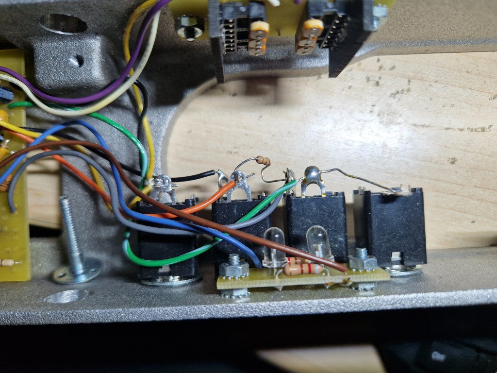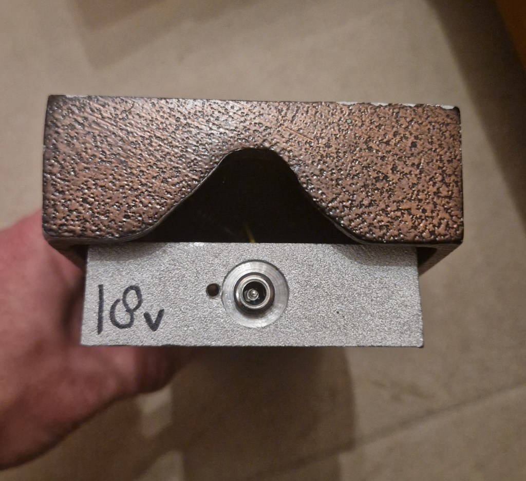 The goal was to design a worry free volume pedal that wasn’t relying on potmeters or moving parts. Designing it worry free (of fail-safe) came to a design with two light-sources (one backup for the other) and a dedicated circuit to make the effect smooth and well sounding. The power to the active circuit was delivered through a DC jack on the back of the pedal but also models were released with an added adapter wire on the side or an extra DC jack on the side next to the inputs. The pedals runs on 18V but I am uncertain of the polarity of the DC; the pedal that came in had a different polarity compared to normal effect pedals (which turned out to be the main issue with this pedal).