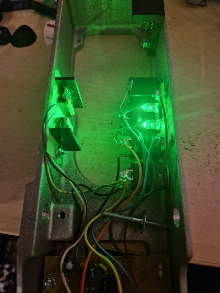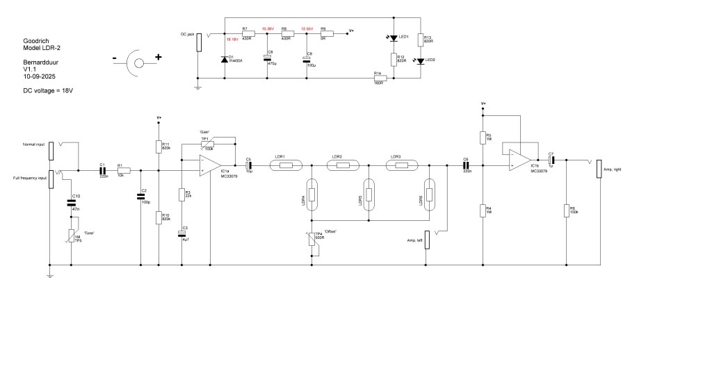 As you can spot the circuit is made with a gain stage (which can be set with a trimpot) and an LED – LDR combo. The outputs are somewhat isolated from each other by a buffer. The effect works with a light-shield that is connected to the treadle This way the light falls on one set of LDR’s giving it the volume control it needs The color of the LED is of green.