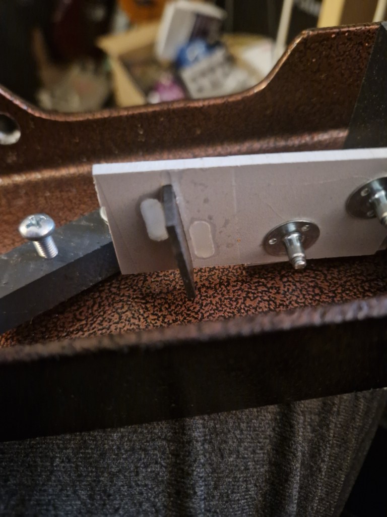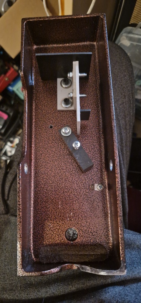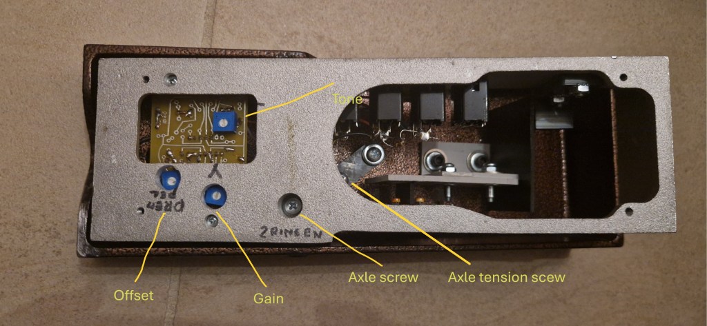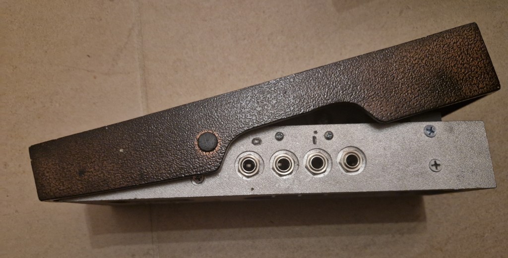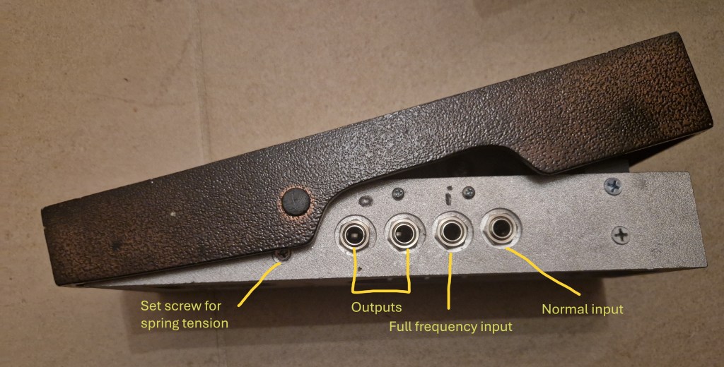 The pedal has two inputs and two outputs. On the underside of the pedal the jacks are explained (although on this model due to Velcro part of this is destroyed). There is a normal input (right) and a full frequency input (left). From the documentation online the full frequency input should bypass the adjustable tone control that is available on the underside of the pedal; this tone control only works with the normal input. Using the full frequency input should give the pedal a more transparent sound with increased treble and headroom compared to the normal input. There are also two outputs that are isolated from each other. On the body of the treadle is a small hole designed to show you part of the light-source. This hole lets you check if the pedal is ‘on’. On the underside you have extra controls for ‘Gain’ (adjusting the amount of volume the pedal should have when the it is in the toe-down position) and ‘Offset’ (controlling the amount of volume in the heel-down position). The feeling of the treadle can be adjusted by a piece of material (wood? plastic?) on the inside located right above the axle. By turning the screw you can make it press down on the axle which determines how easy the treadle can move. On the side a small screw is visible; this screw sets the tension of the spring that makes the pedal return to the heel-down position but also determines the feeling of the treadle when pressed down.