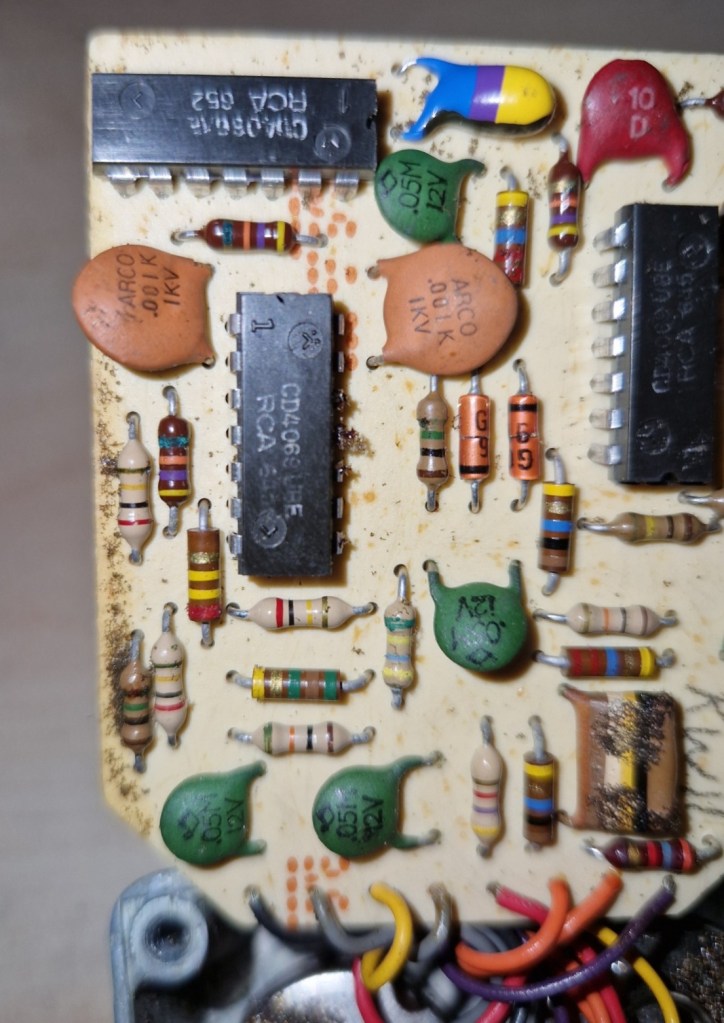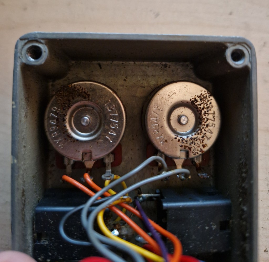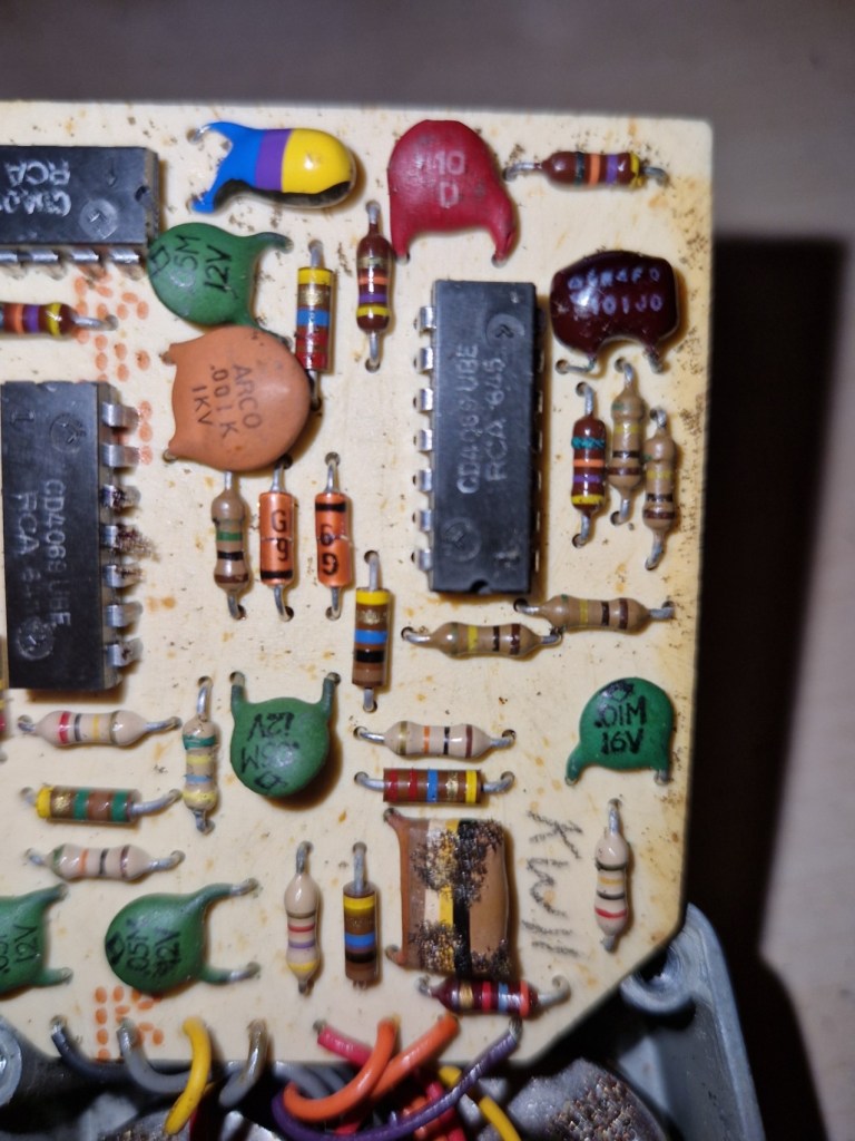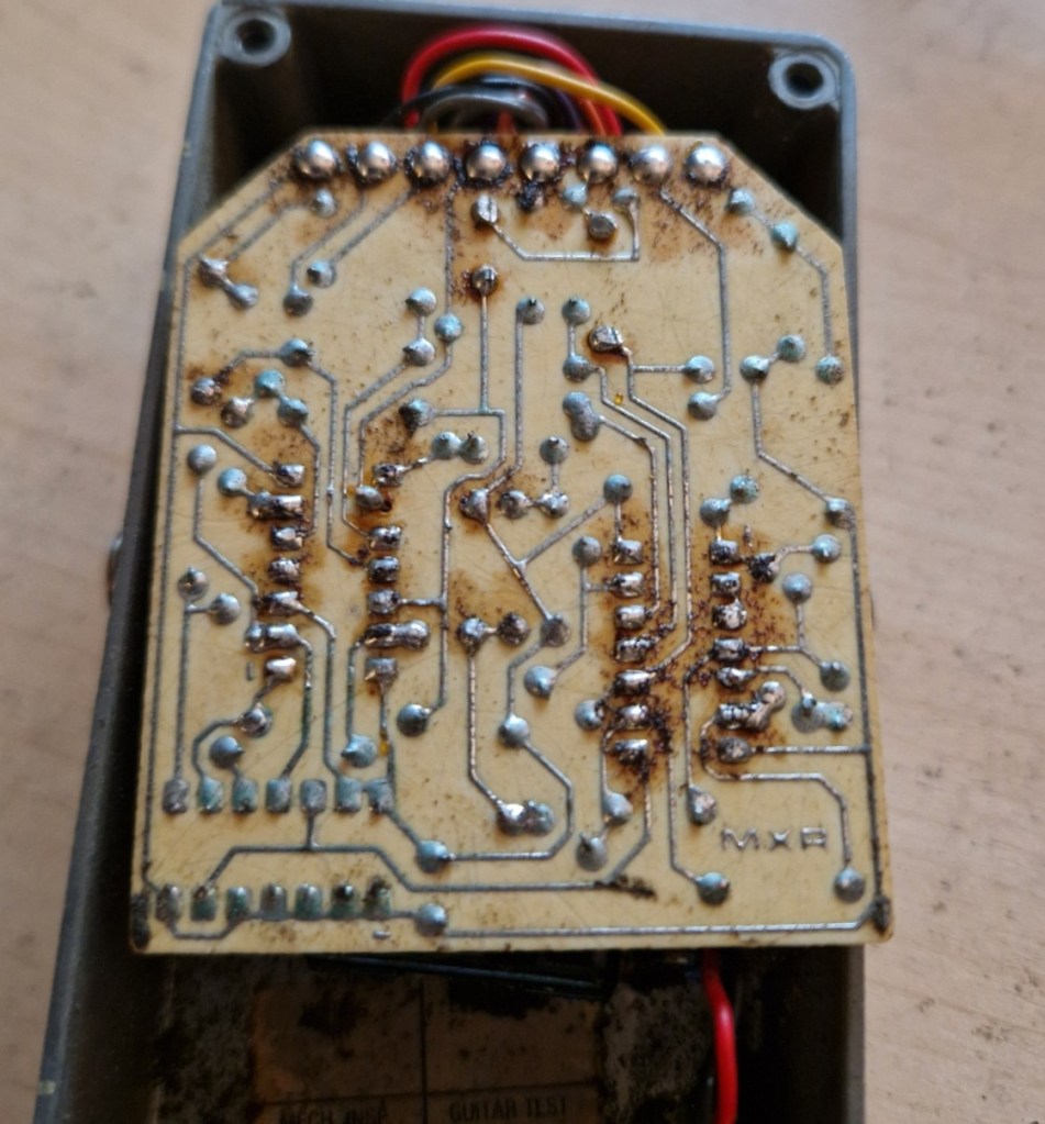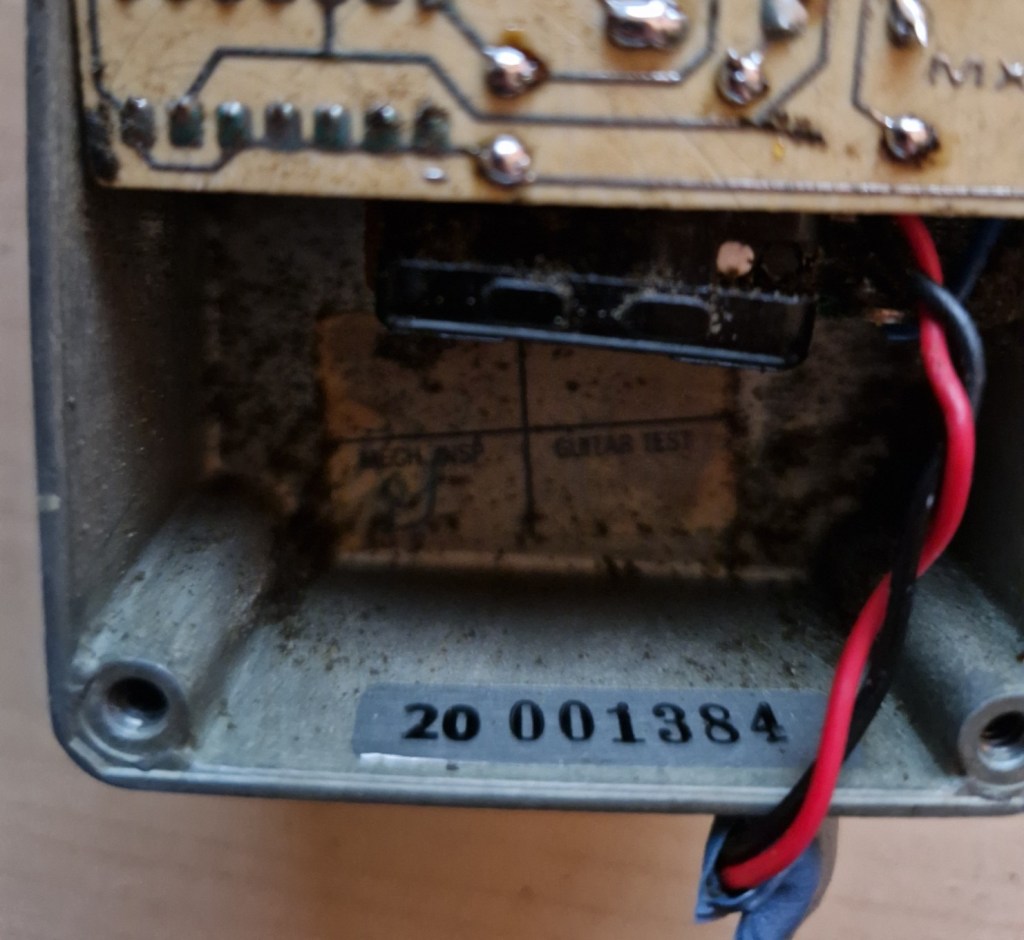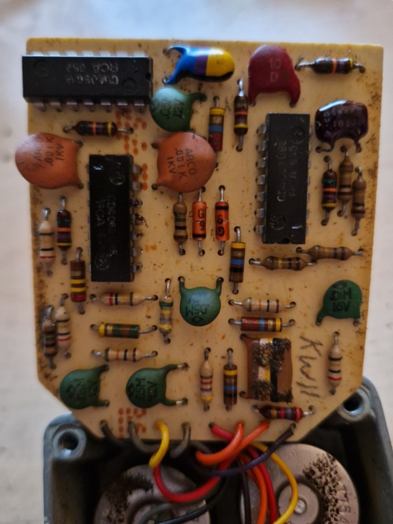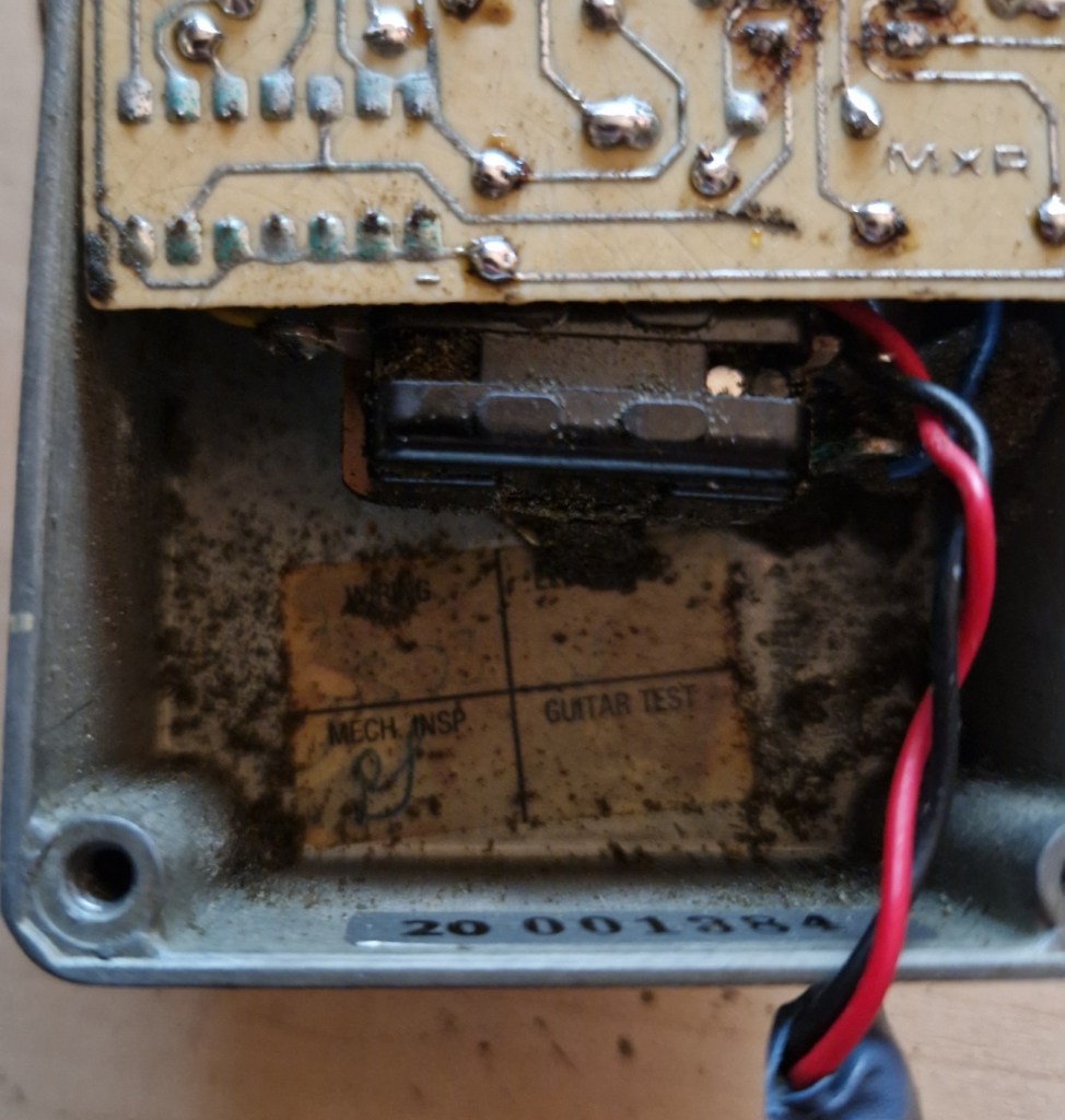 On the inside you can spot a beautiful made PCB with a tropical fish cap, various different kind of resistors and caps and three large IC’s that makes the effect. The other parts of the pedal are connected by colored wires that feed the PCB on the top of the PCB. The circuit was housed in a piece of foam that was completely destroyed by time.