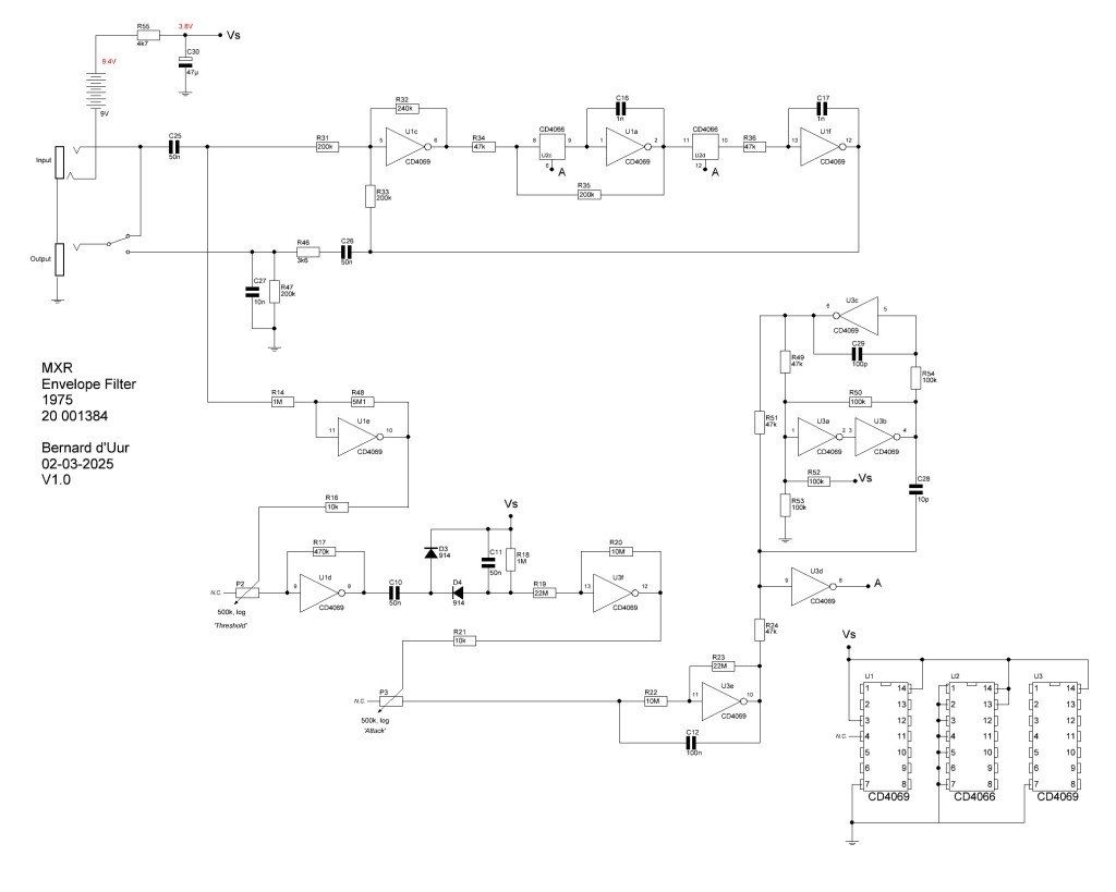 As you can spot the pedal works with two inverter IC’s and a single quad switch IC. Of the quad switch IC only two switches function; the other ones are disabled. The pedal works on a single 9V battery but the 9V is quickly transposed to a lower voltage that drives all IC’s and function. In all the schematic’s I saw, this wasn’t made that clear to me.
