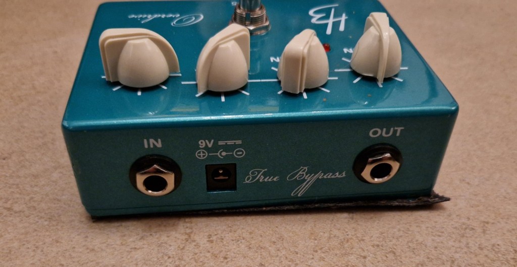 The pedal is housed in a bigger aluminium box comparable to a phase 100 on it’s side. On the back are the connectors for the jacks and the DC jack. The pedal runs on 9V by an adapter or on a battery. Four knobs are on the faceplate that lets you control the amount of overdrive (‘Gain’), the EQ of the overdrive (‘Tone’), the amount of clean blended in the output signal (‘Clean’) and the output volume of the mix (‘Level’). The footswitch turns the pedal on and off.