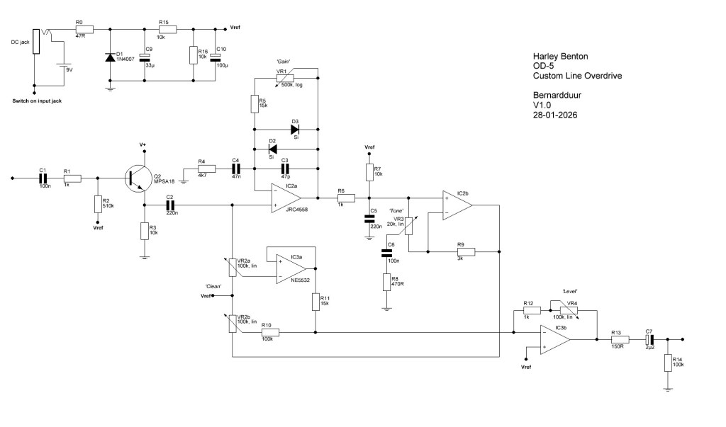 As you can spot this pedal is an almost 100% clone of the Voodoo Labs Sparkle Drive. The only differences are in some resistor values; the resistor that sets the minimum gain is lower (R5, less gain on full CCW setting of the gain knob) and some small resistors in the audio path were changed to normal, available values (Voodoo Labs used not common values in some spots). If you compare both the schematics you can easily spot the differences. Harley Benton even used the same resdef as Voodoo Labs and the exact same transistors and IC’s. The unit is true bypass with a TPDT switch (not drawn in the schematic) and has no pull down resistor on the front just like the Voodoo Labs version (but this Voodoo Labs version had a very specific switch IC that didn’t need a pull down resistor). Expect some popping!