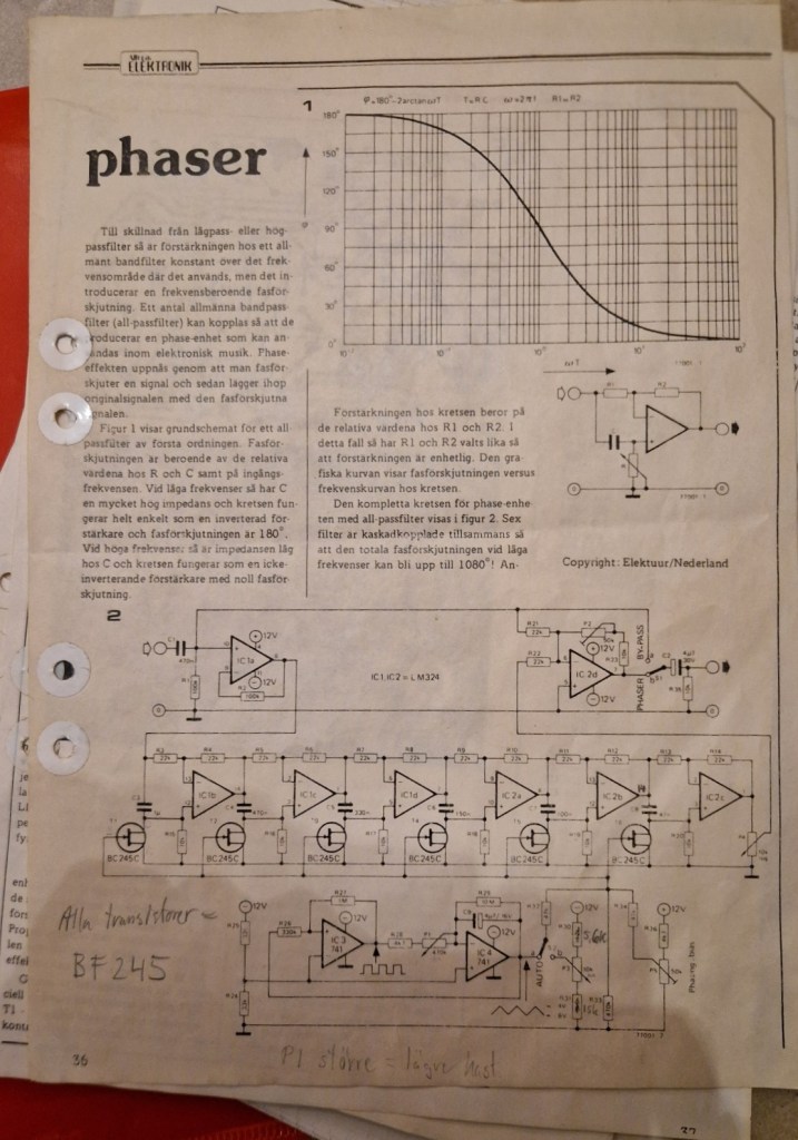 The phaser circuit was originally printed in the Dutch magazine Elektuur in their July / August edition of 1977 called the Miniphaser. The version in Swedish was possibly reprinted in a Swedish Electronics magazine.