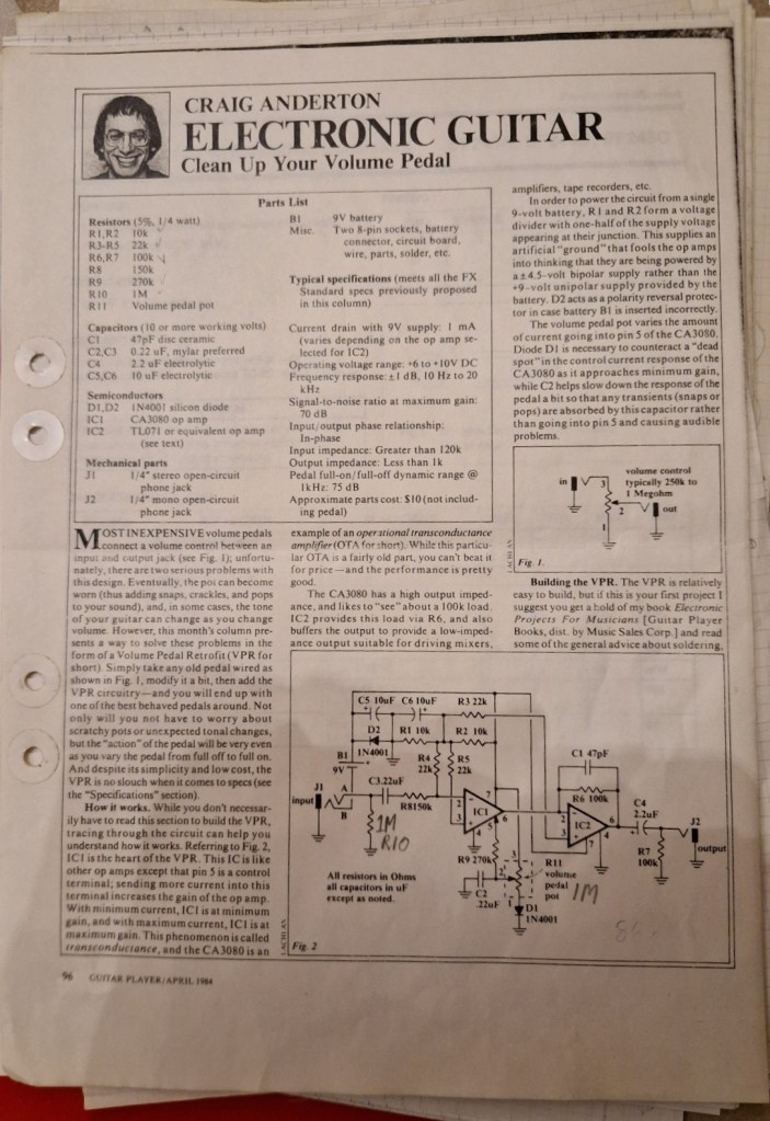 The volume pedal part was published in the April edition 1984 of Guitar Player magazine and was designed by the guru Craig Anderton. I can’t find the article online but can find this project at Tonepad called ‘Volume pedal retrofit’.