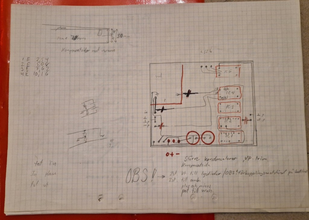 The builder was unknown to me when I started this repair. All papers are signed with AW (initials?) and a number (my best guess is that these number indicate year – month – day making this pedal built in 1986). Only one paper has handwritten comments on it in a foreign language (Swedish I figured) and the article on the phaser is also in Swedish. On the inside of the pedal the number 110 is written down; the 110th pedal?