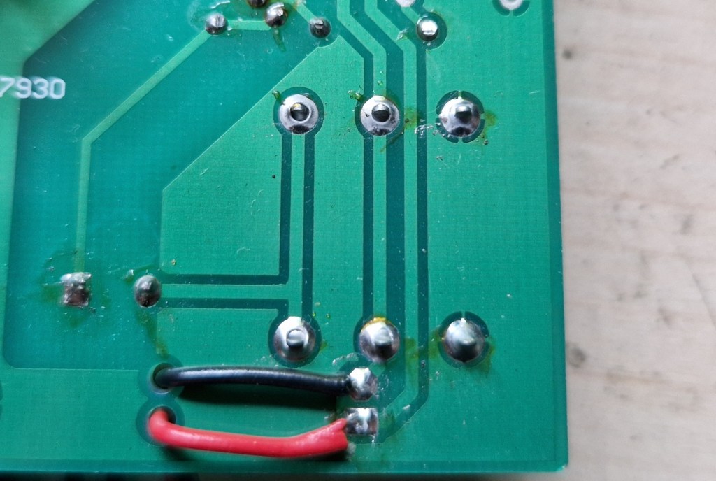 If you look at the schematic you can spot a 1M to V+ on the solder side of the main PCB. I have no other units to compare it to to see if this was a common ‘choice’ or just a fault. I ‘think’ that this 1M was introduced to keep the pedal from popping when pressing the footswitch (pull down resistor) and that it originally should be connected to ground and not V+. You can also spot on the PCB that there is a reserved place for a pull down resistor but that the builder choose to swap the first cap and resistor with each other and thus make this location useless. I cannot see the reason to do that.